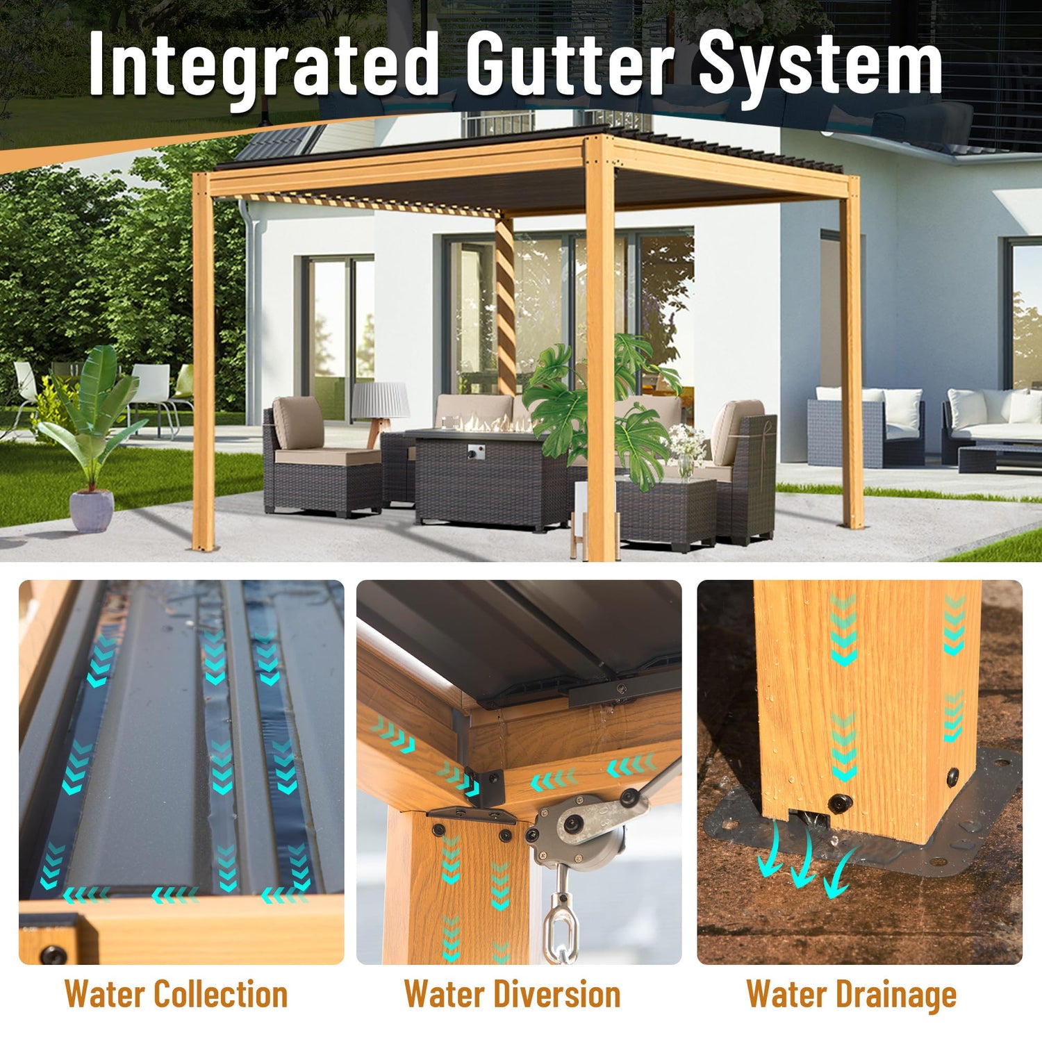 - 💛☔Advanced Drainage System- Domi outdoor pergola's advanced drainage system efficiently collects rainwater, channeling it down through four pillars, ensuring you stay dry during summer BBQs or any events. Enjoy shelter from sun and rain while relishing the soothing sound of rainwater cascading into collection gutters.