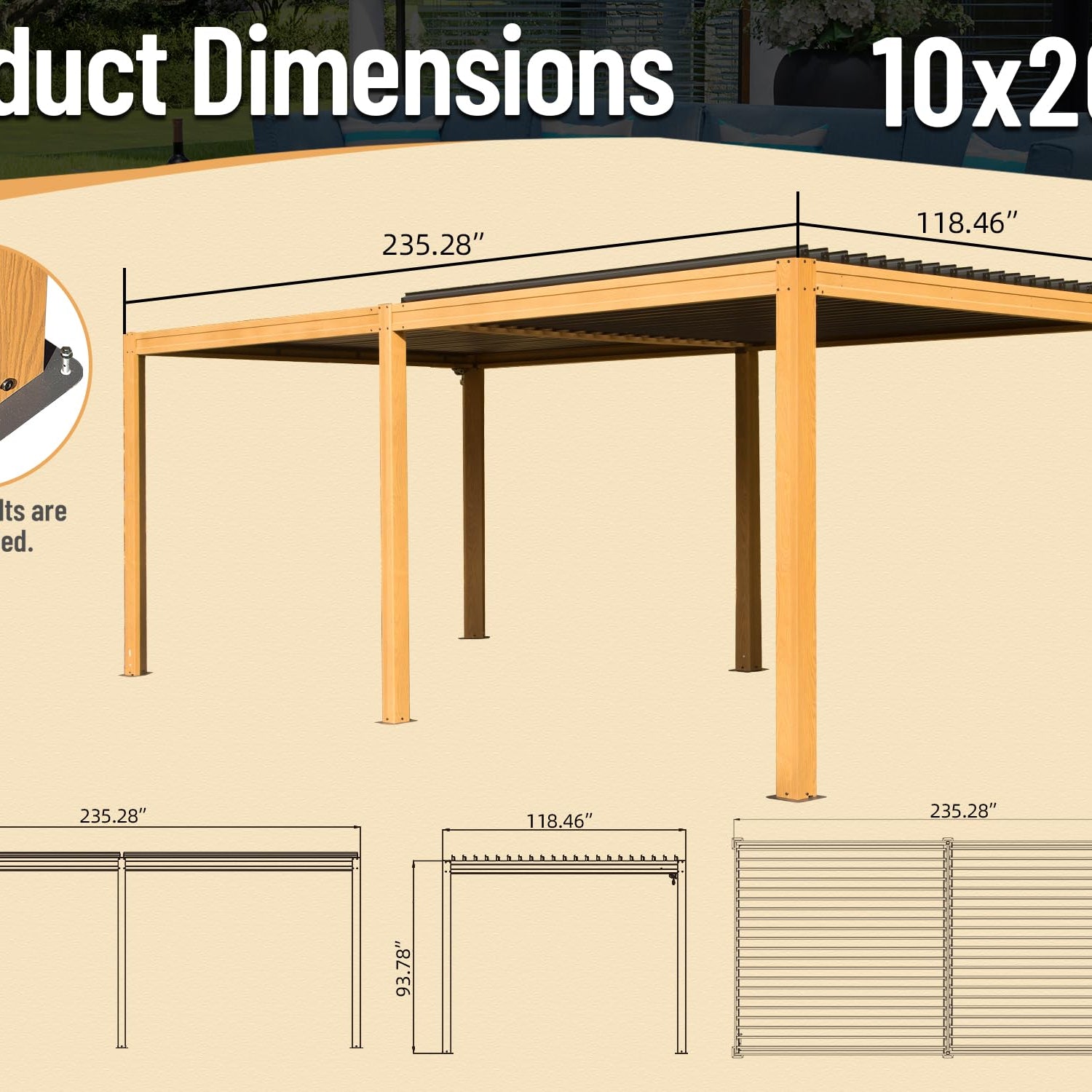 Domi Louvered Pergola 10X20FT, Wood Grain Aluminum Pergola with Adjustable Roof, Wood Looking Aluminum Frame, Efficient Drainage System, Outdoor Pergola for Patio, Deck, Garden