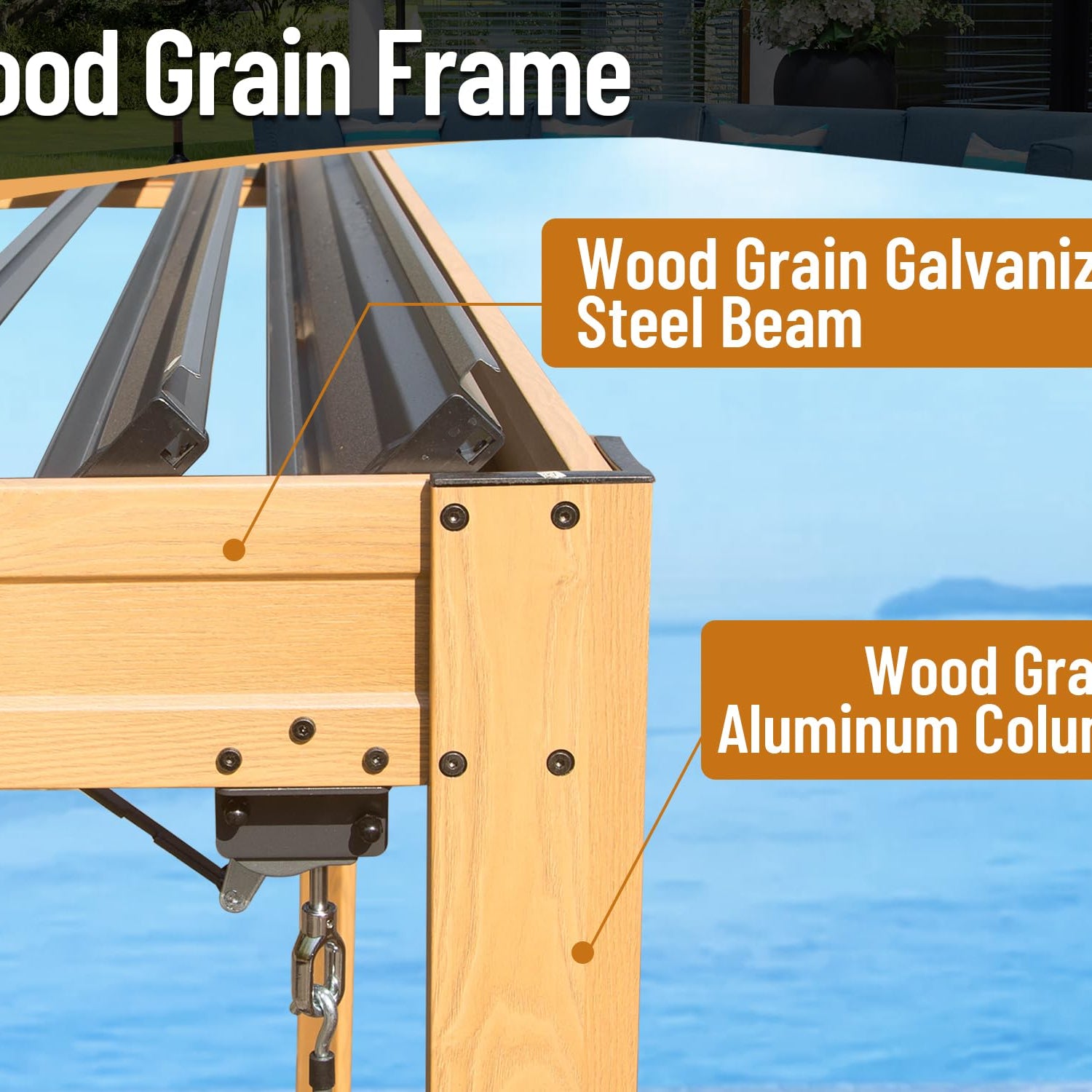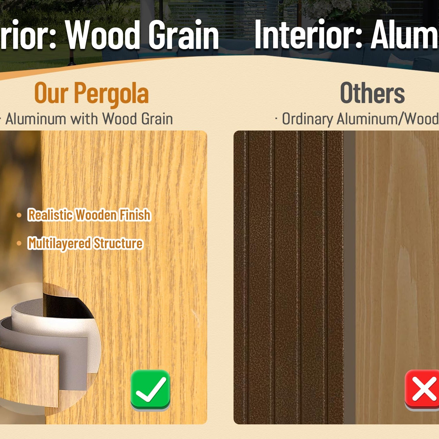 - 💛🌳Timeless Wood-grain Charm- Elevate your outdoor space with Domi's metal pergola, featuring advanced heat transfer technology for a stunning wood-grain finish! Enjoy the elegance of wood without the maintenance hassle, creating a comfortable and natural ambiance effortlessly.
