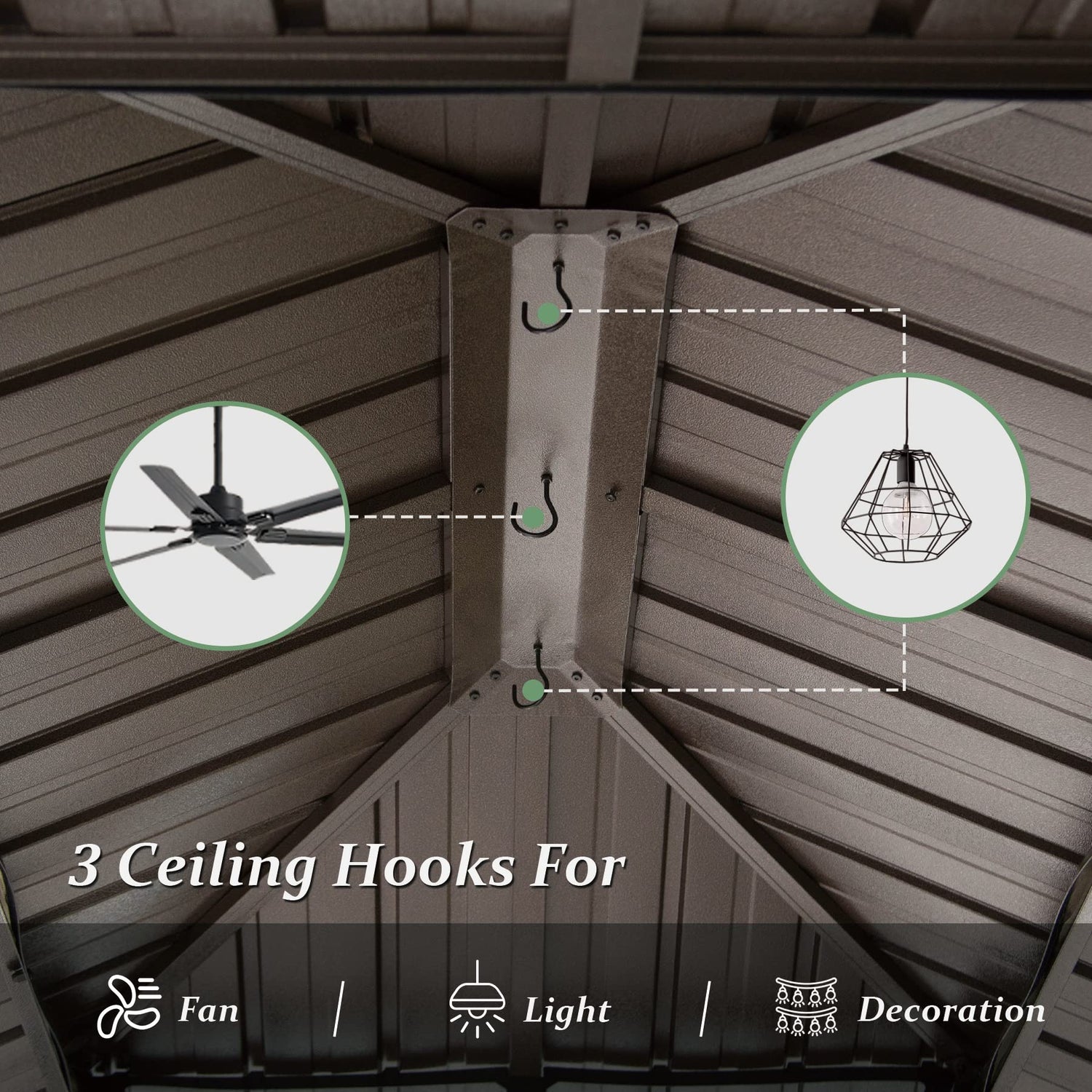 - 🏡Multifunctional Ceiling Hooks- Domi metal roof gazebo has 3 ceiling hooks! These hooks are designed to easily support decorative items, fans, lights, and even heaters, adding both functionality and style to your outdoor space.
