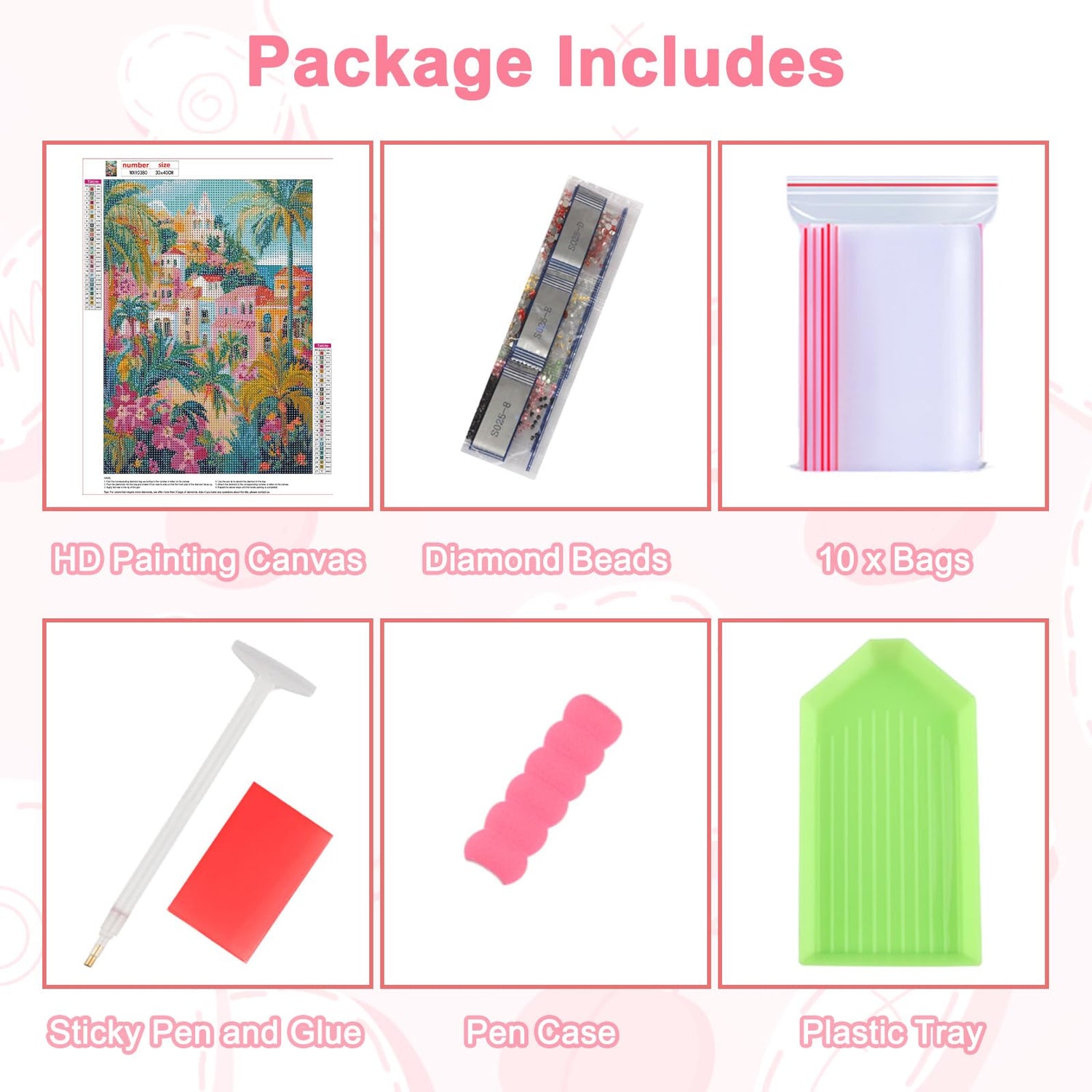 - Diamond Painting Kit Included:1*canvas(12x16inch), 1*diamond pen, 1* glue, 1*new design plastic tray, self-sealing bags and enough round diamonds. You get about 30% extra beads in every color. A diamond canvas kit lets you make stunning diamond art, no artistic skills required. We have various kits such as diamond painting kits, diamond painting kits landscape, and beach diamond painting kits for adults