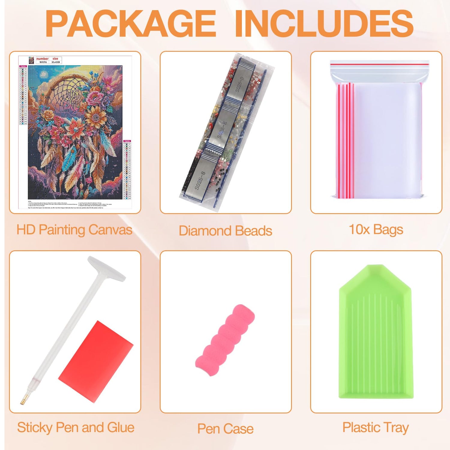 - 5d Diamond Paintings: Each diamond painting comes with all tools in need. 1*HD painting canvas, 1*diamond pen, 1*cube diamond tray, 1*red glue clay, 1*pen grip, plastic bags for putting diamonds, and enough colorful round diamonds. We'll provide 30% diamond more than need