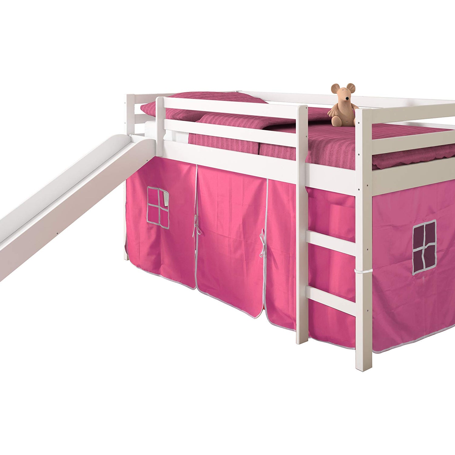 Donco Kids Low Loft Bed with Slide and Pink Tent, Twin, White