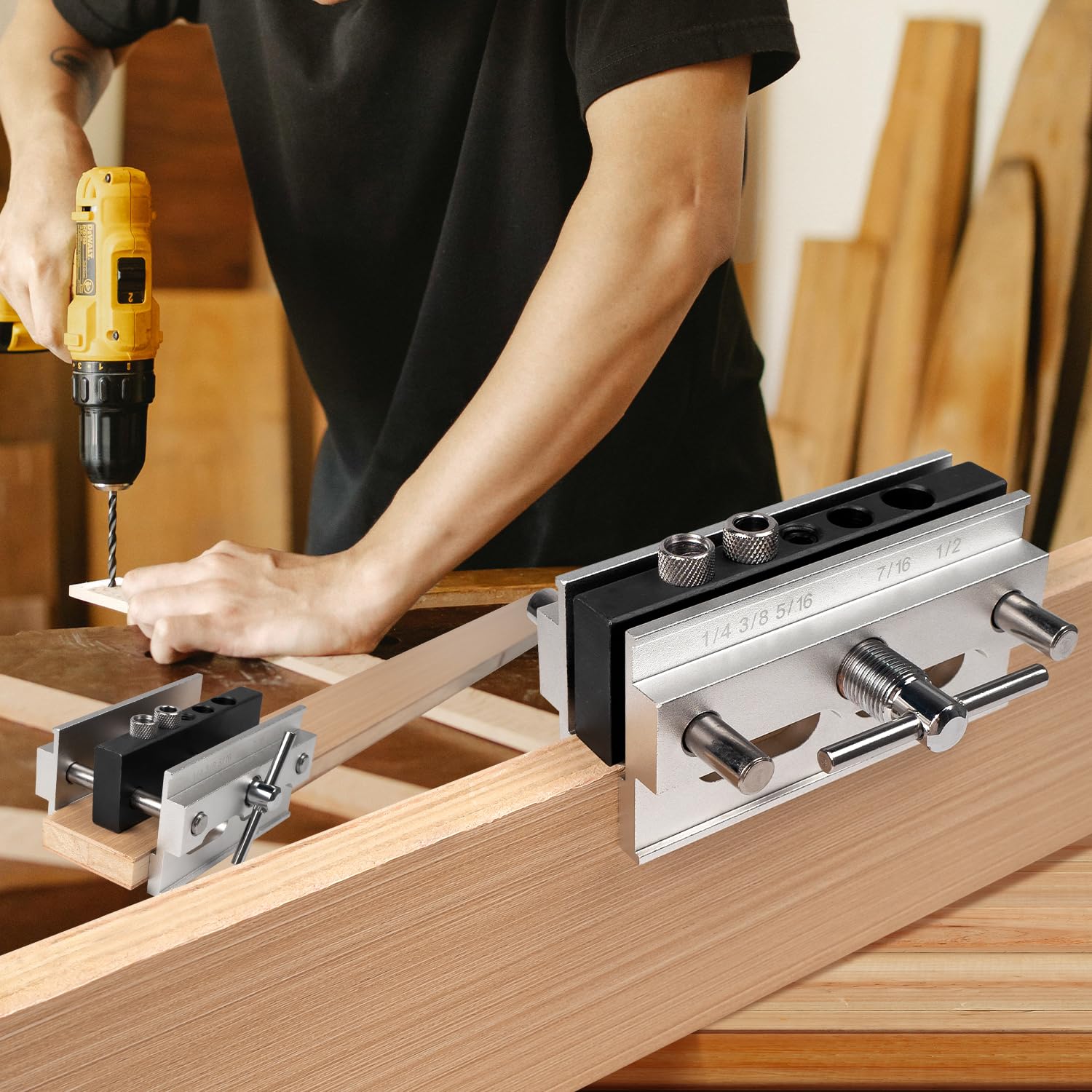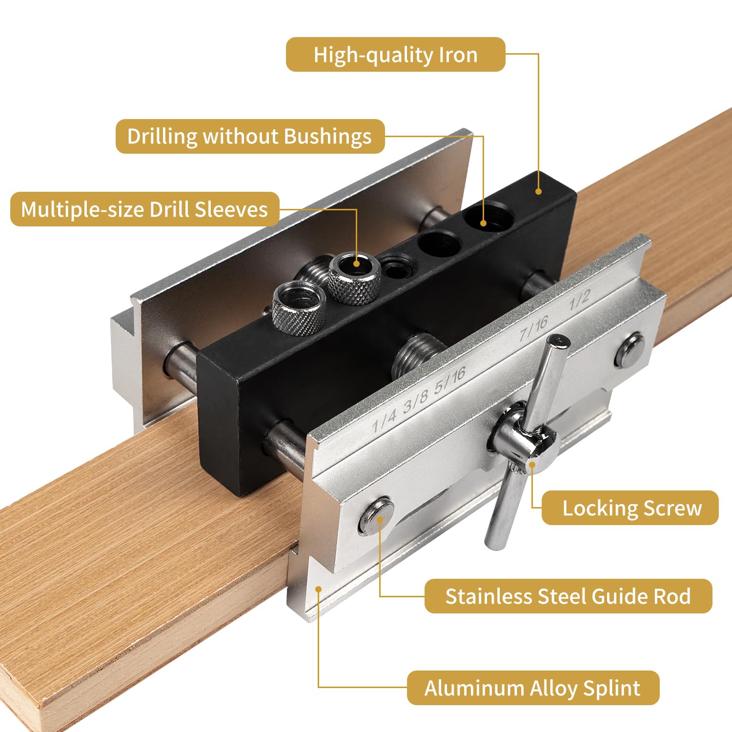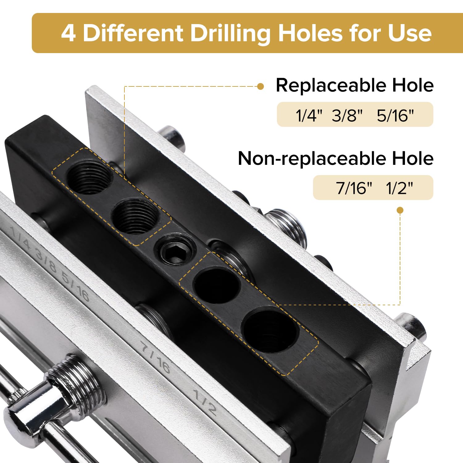 - 5 DRILL SIZES: This drill jig comes with 5 drill sizes - 1/4", 3/8", 5/16", 7/16", and 1/2", allowing you to easily work with different size mortise and tenon joints. The top of the dowel jig features 4 drill guide holes, with 2 holes accepting 7/16" and 1/2" drill bits directly, while the other 2 holes accept threaded replaceable steel bushings