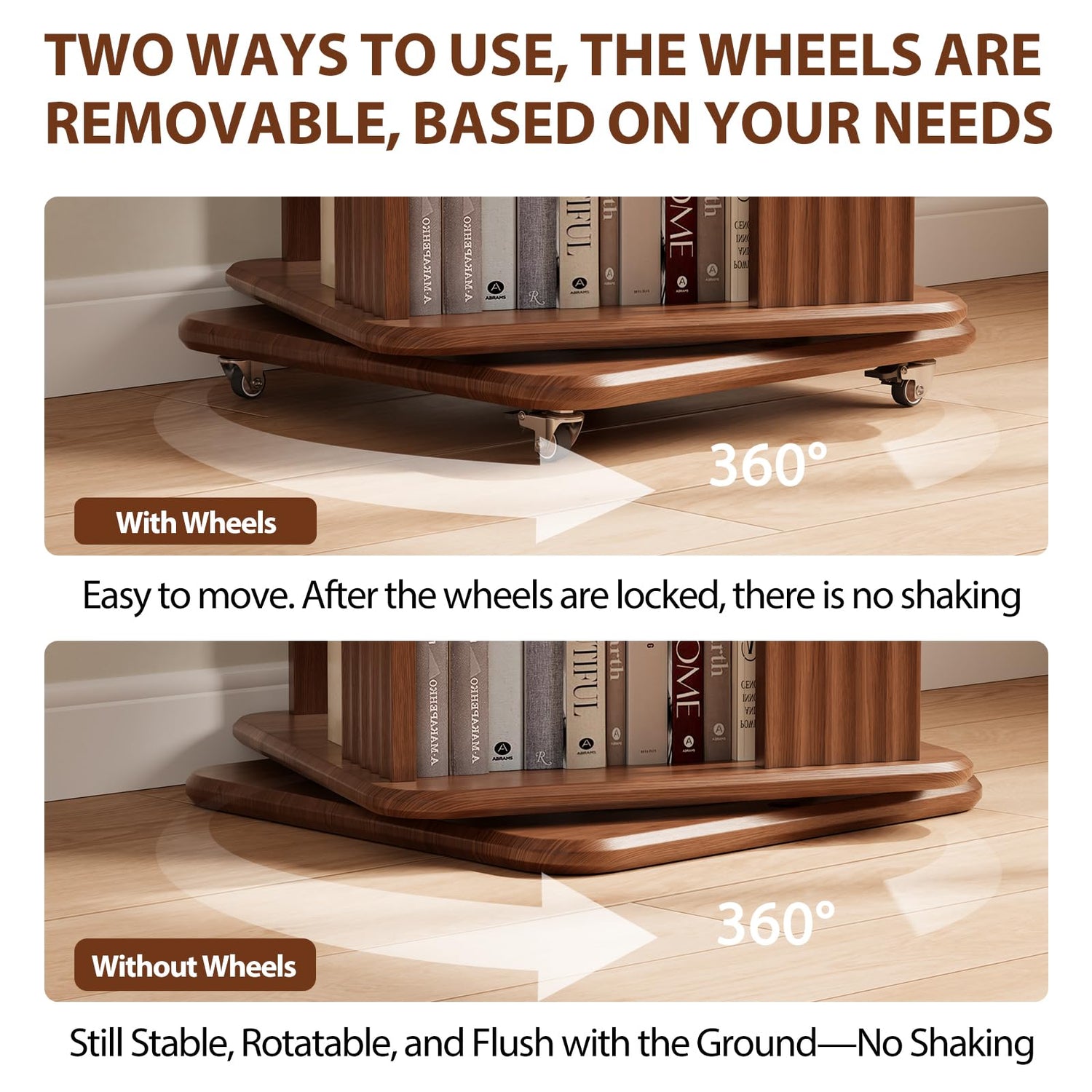 - 【360° ROTATING DESIGN WITH LOCKING WHEELS】This rotating bookshelf tower offers easy access and mobility with locking wheels, while remaining fully stable even when the wheels are removed