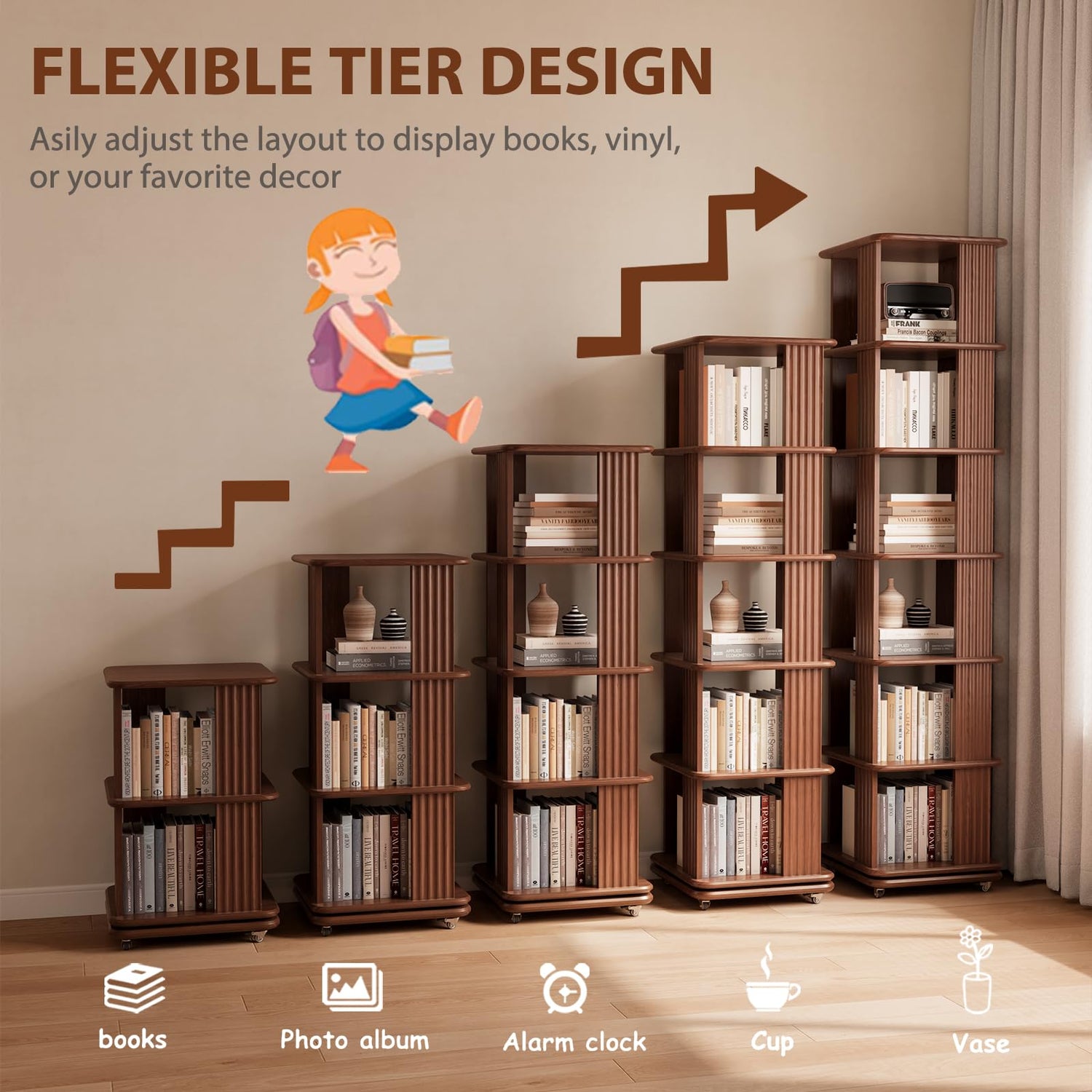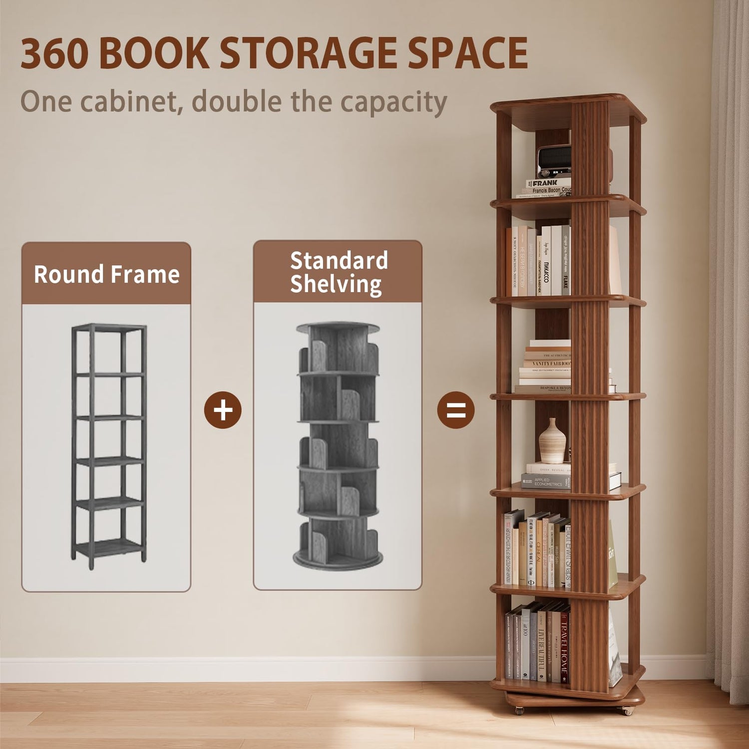 DONGMUWUJEE Solid Wood Rotating Bookshelf, 6-Tier Rolling Book Shelf,360 Degree Revolving Bookcase,Spinning Bookshelf Tower for Small Spaces, Corner, Bedroom,Office,Living Room,Classroom (Walnut)