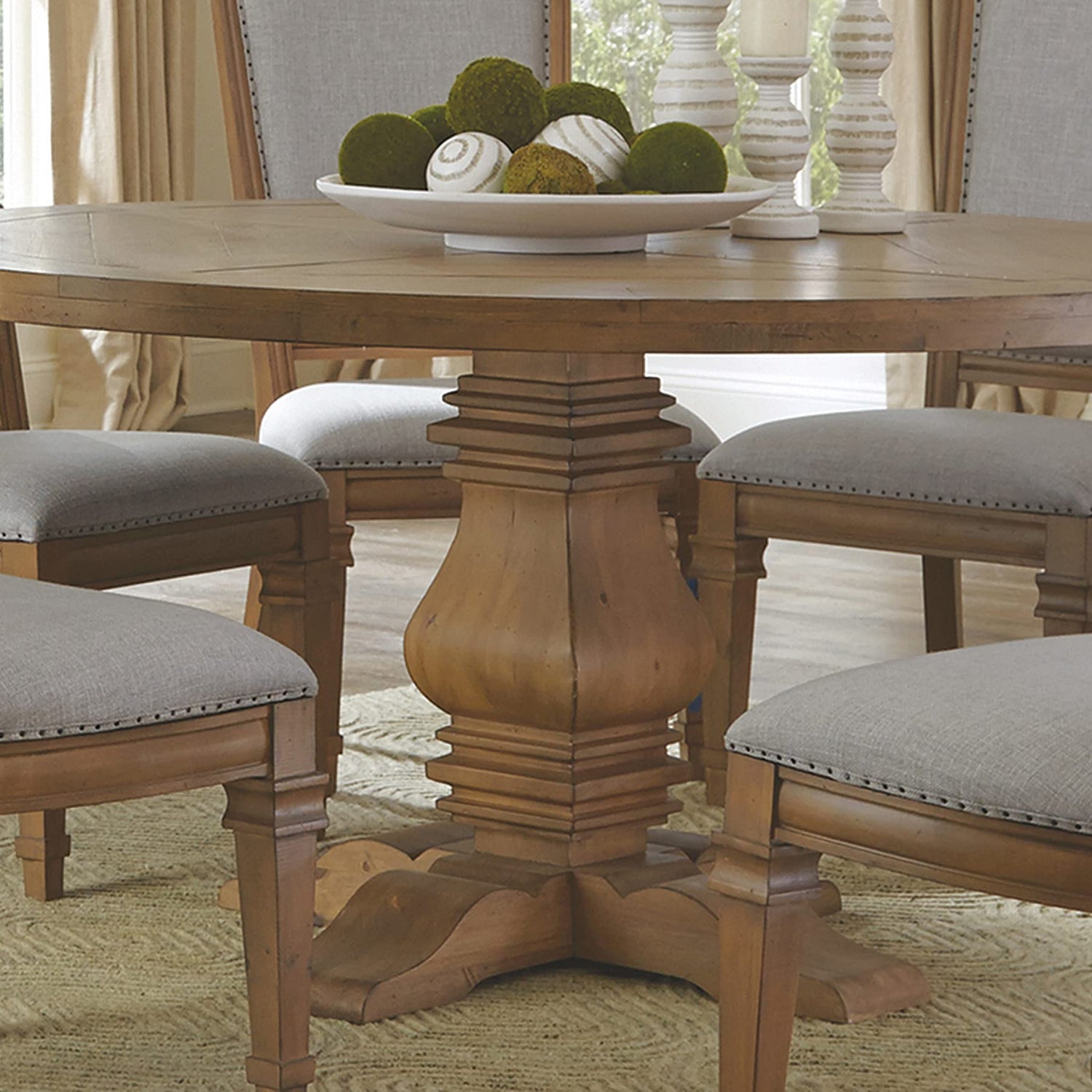 This round dining table showcases a classic form with updated embellishments. Embrace a traditional pedestal silhouette with a casual aesthetic. Rustic smoke offers an attractive finish that blends with a variety of palettes. Elegant sculpting on its pedestal and cross-foot base jazz up its design presentation. Choose this dining table for a compact space and select fabulous chairs to complete a fashionable package.