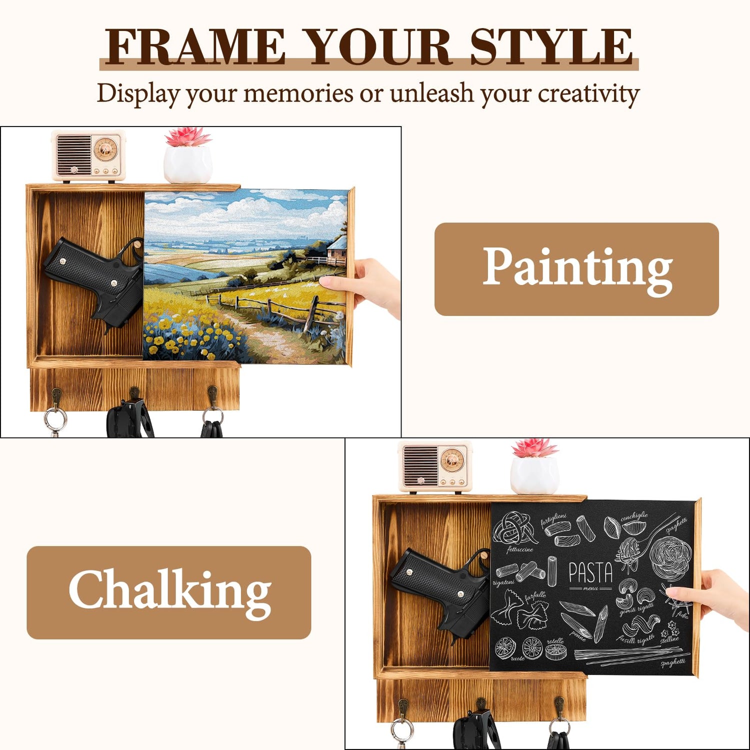 - Sturdy Metal Hook: Designed with versatility in mind, this wall gun safe picture frame comes with 3 sturdy metal hooks for hanging keys, sunglasses, or lanyards to keep your small everyday items organized! It is a 3-in-1 organizer that can be used in hallways, entryways, or living rooms and more, combining concealed storage with everyday functionality.