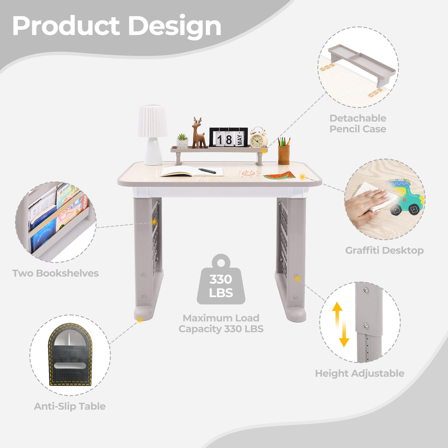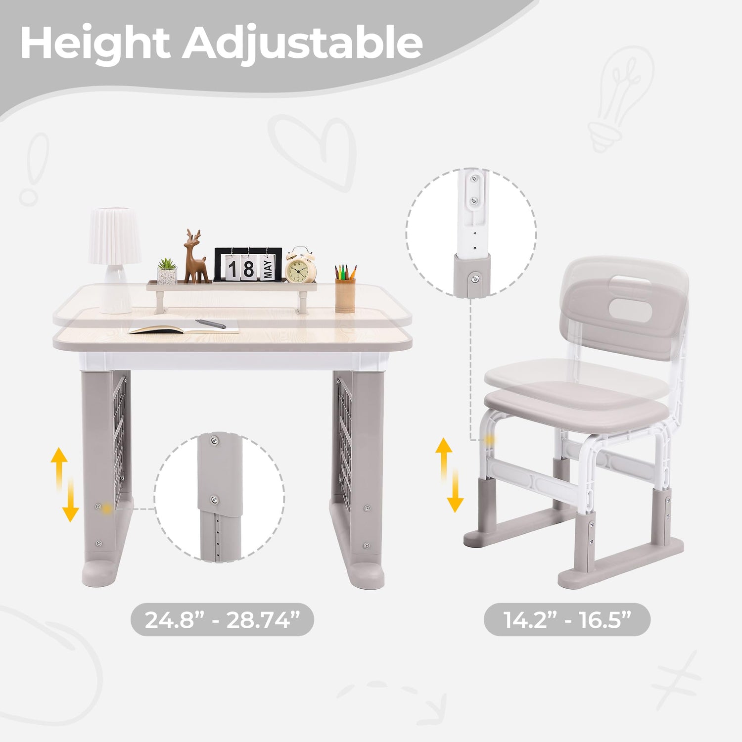 - Height Adjustable: The tabletop size of the Children Study Table and Chair Set is 35.75” L×23.94”W, and it can be adjusted to 6 heights within the range of 24.8”-28.74”. The seat size of the kids play table is 15.35”L×12.2”W, which can be adjusted to 14.2”, 15.35” and 16.5”. The height of the backrest is 24.8”, 25.98” and 27.16”. The detachable shelf on the tabletop is 19.3”L×4.7”W×3.7”H. The two bookshelves on the side of the desk and chair set are 16.1”L×15.4”H in size.