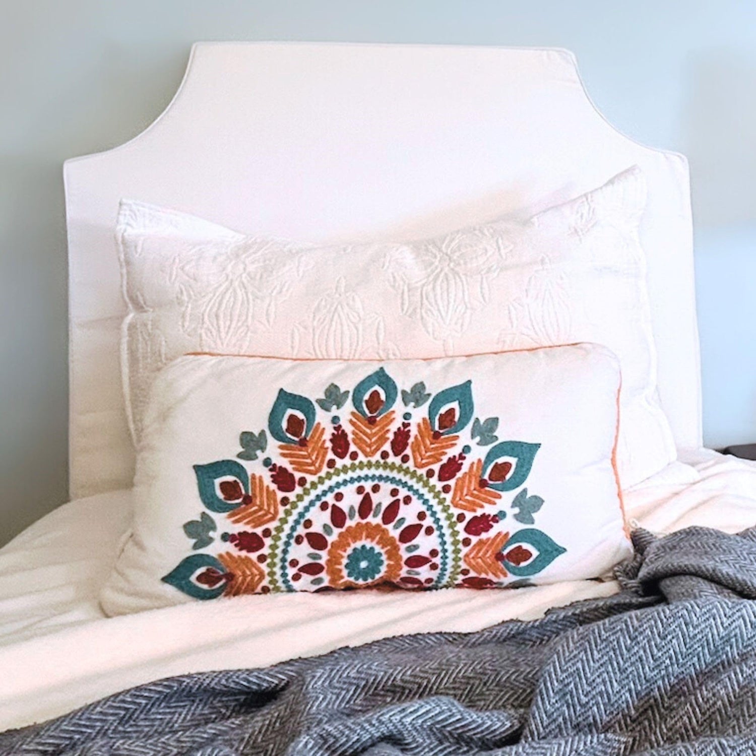 - The 'easy' twin headboard. Designed with the dorm lifestyle in mind. This stylish twin headboard cushion pillow is delivered in a compression bag & weighs only 4 lbs. - Making it convenient to carry from the mail room or squeeze in the college bound car.