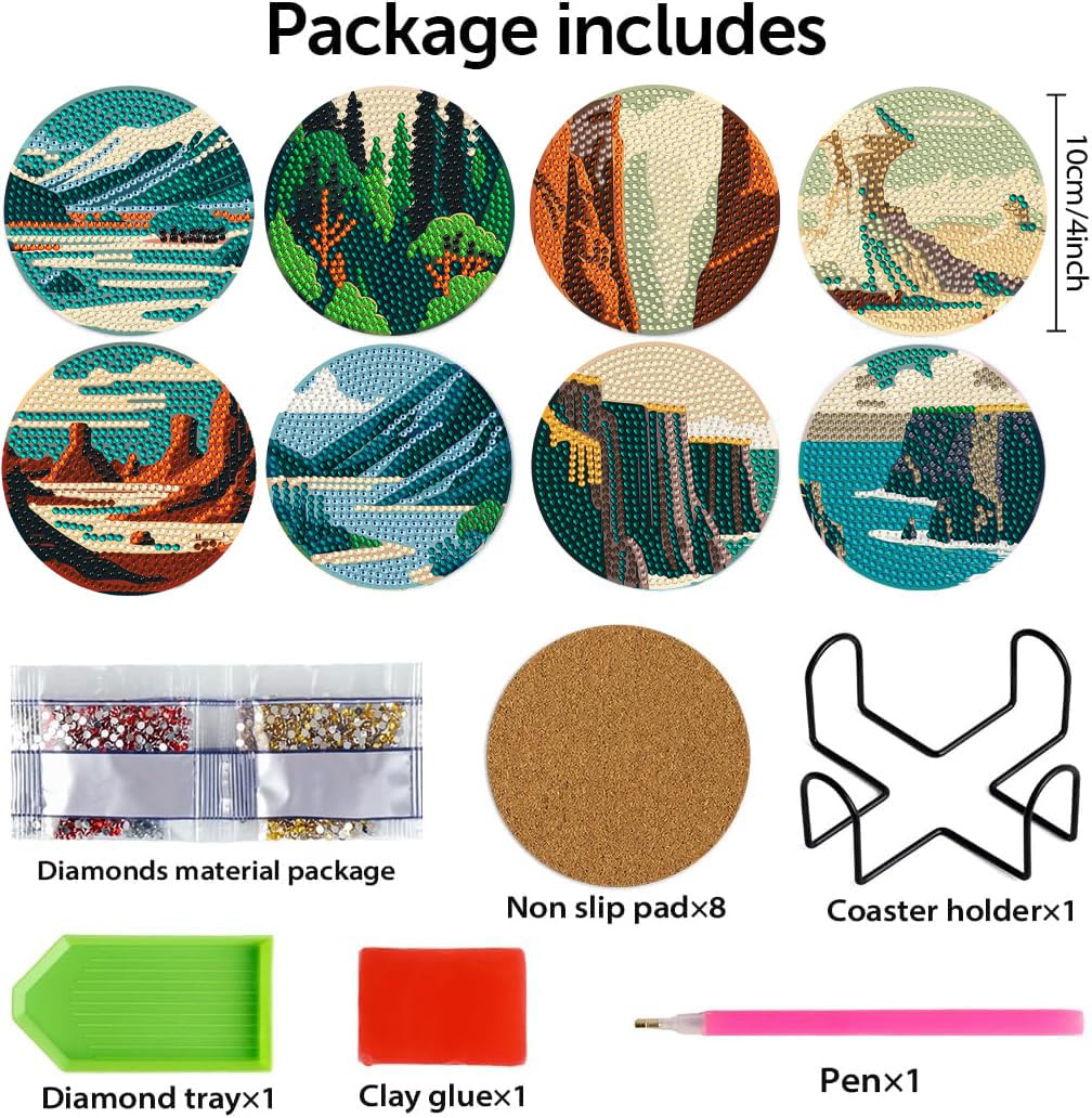 - The Kit Includes: DOTZSO the 8 Pcs diamond art kits for adults kit has everything you need to complete six beautiful coasters and is equipped with a set of diamond painting accessories including a diamond painting pens, multiple colored diamond dot art, red glue clay and a diamond tray, this complete set allows you to dive right into your diamond art project, providing a satisfying and relaxing experience, elevate your crafting skills with this comprehensive