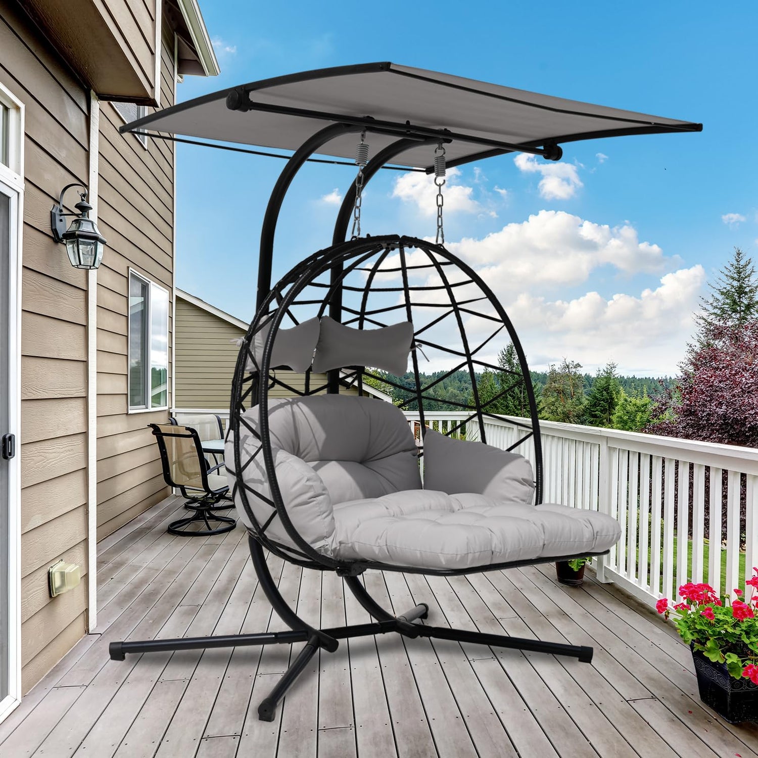Double Egg Chair Outdoor with Stand & Adjustable Canopy, Extra Large 2 Person Patio Egg Chair with Leg Rests, Hanging Swing Chair with Thickened Cushion, Swinging Love Seat for Outdoor Patio (HQH)