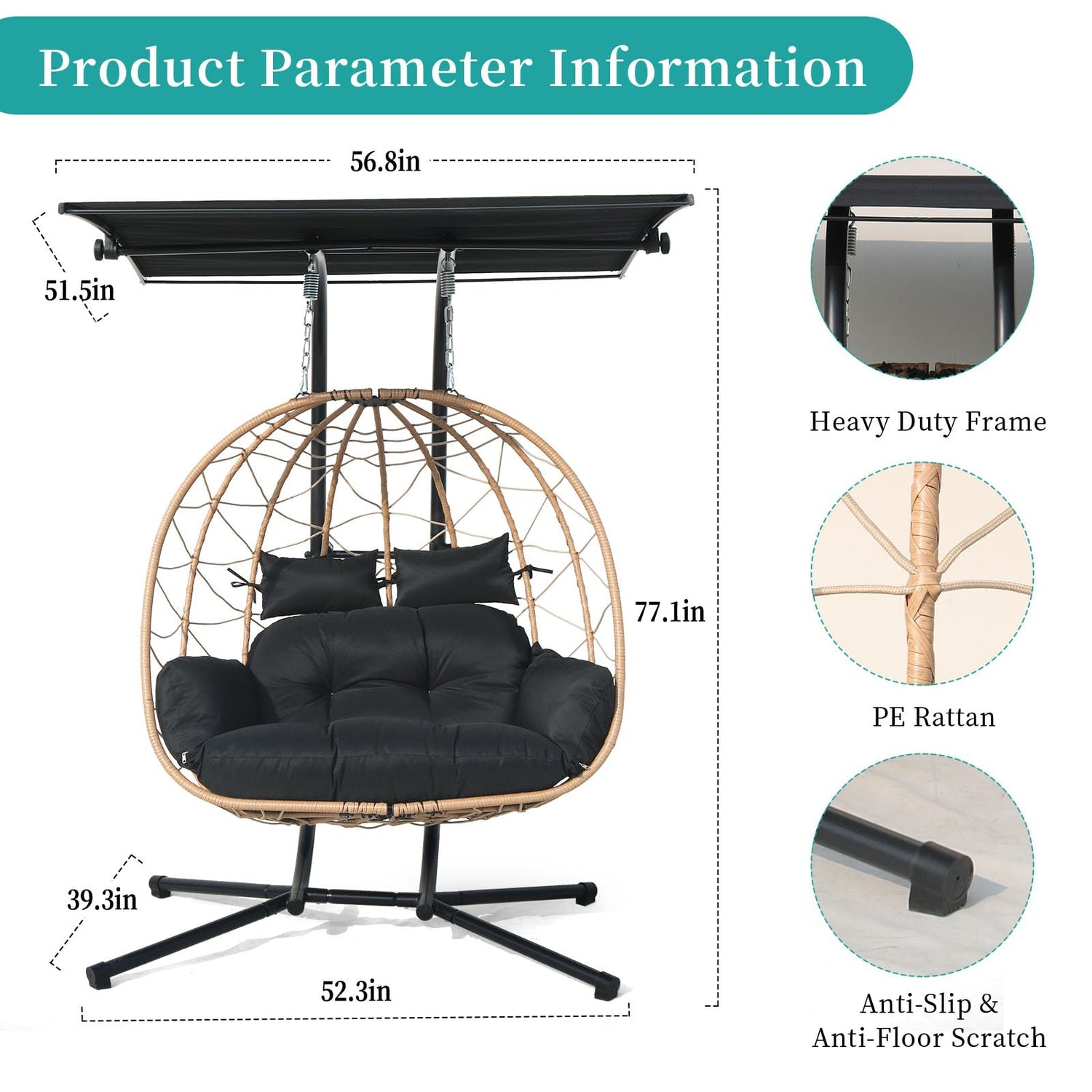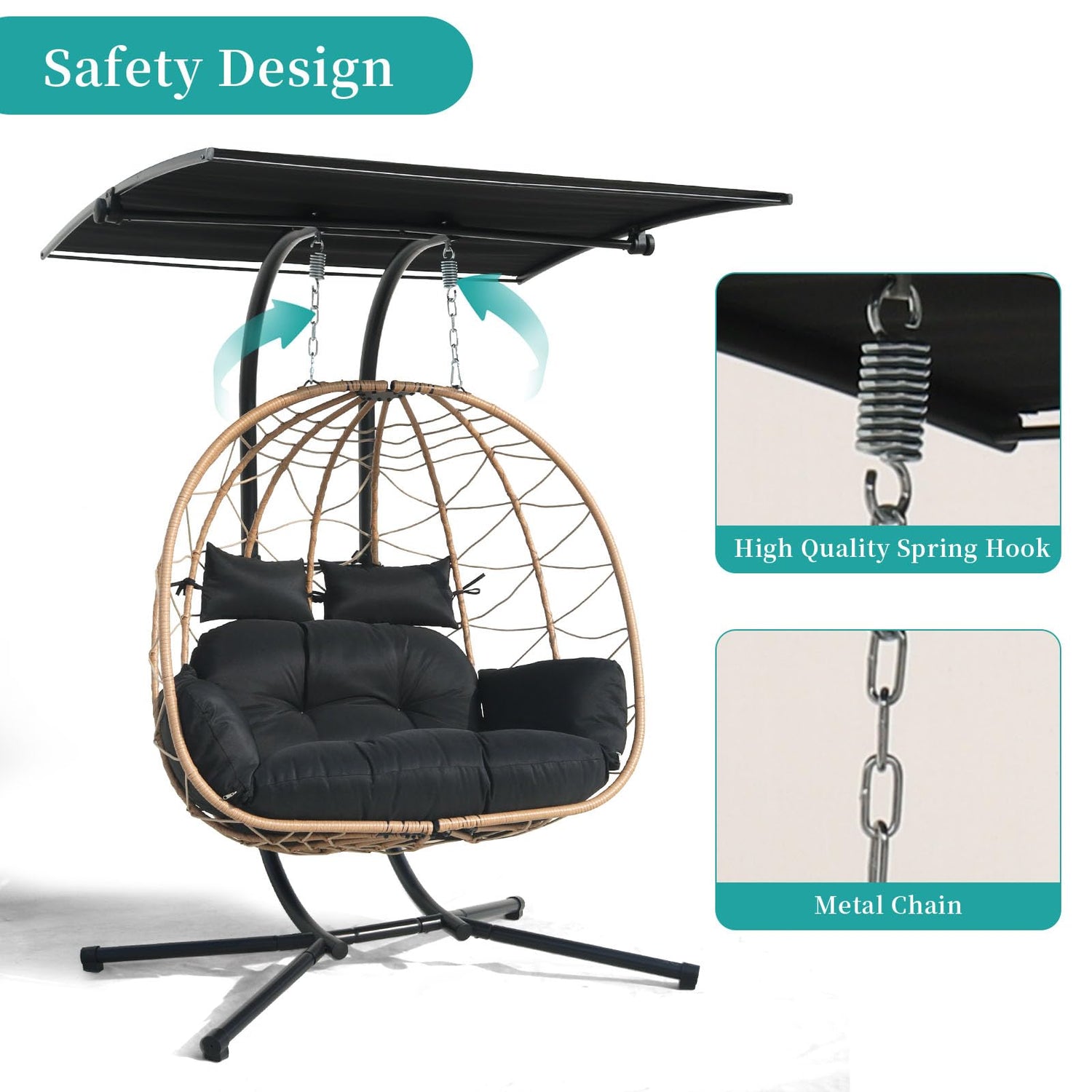 Double Egg Chair wth Stand Hammock Swing Chair Foldable Hanging Loveseat, Outdoor Hammock Egg Chair for Patio, Bedroom, Garden and Balcony (Black)