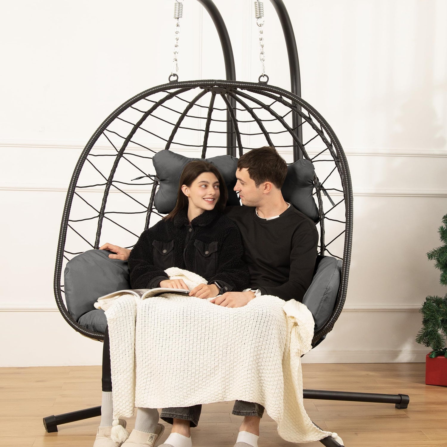 Double Egg Chair wth Stand Hammock Swing Chair Foldable Hanging Loveseat, UV Resistant Removable Cushions, 700LBS Capacity for Bedroom, Balcony, Garden(BK-GR)
