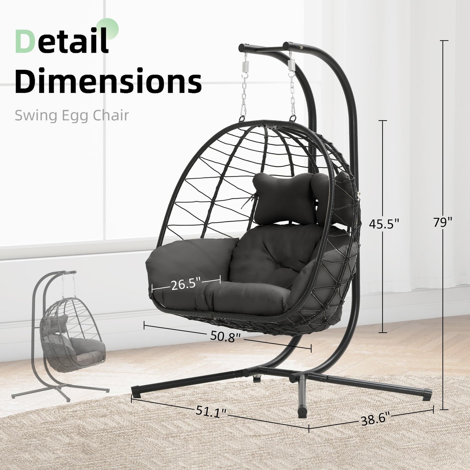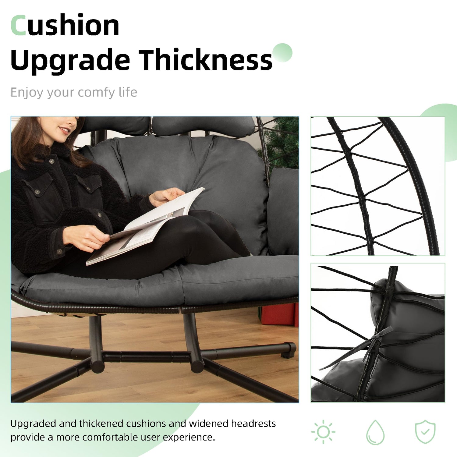 - GOOD COMFORT:The DoubleTT swing egg chair has an ergonomic design that allows you to sit on it for a long time without feeling tired. The thickened cushion has good support and cushioning performance. The curves inside the egg chair support the natural contours of the body, providing you with a comfortable and relaxed experience.