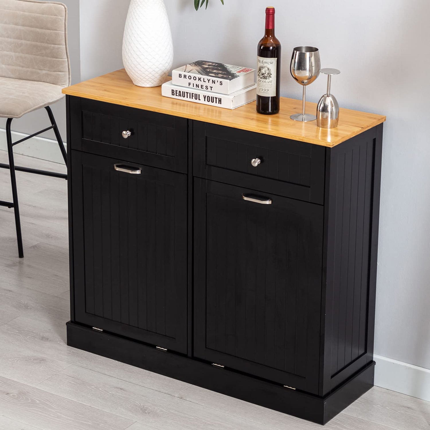 - 【Solid MDF Wood Material】The double tilt out trash cabinet is made of MDF wood with great polished, It’s strong enough to stand the microwave oven, blender, coffee maker or air fryer. It's easy to clean. This trash bin cabinet is heavy enough that your dog can no longer knock over the garbage can.