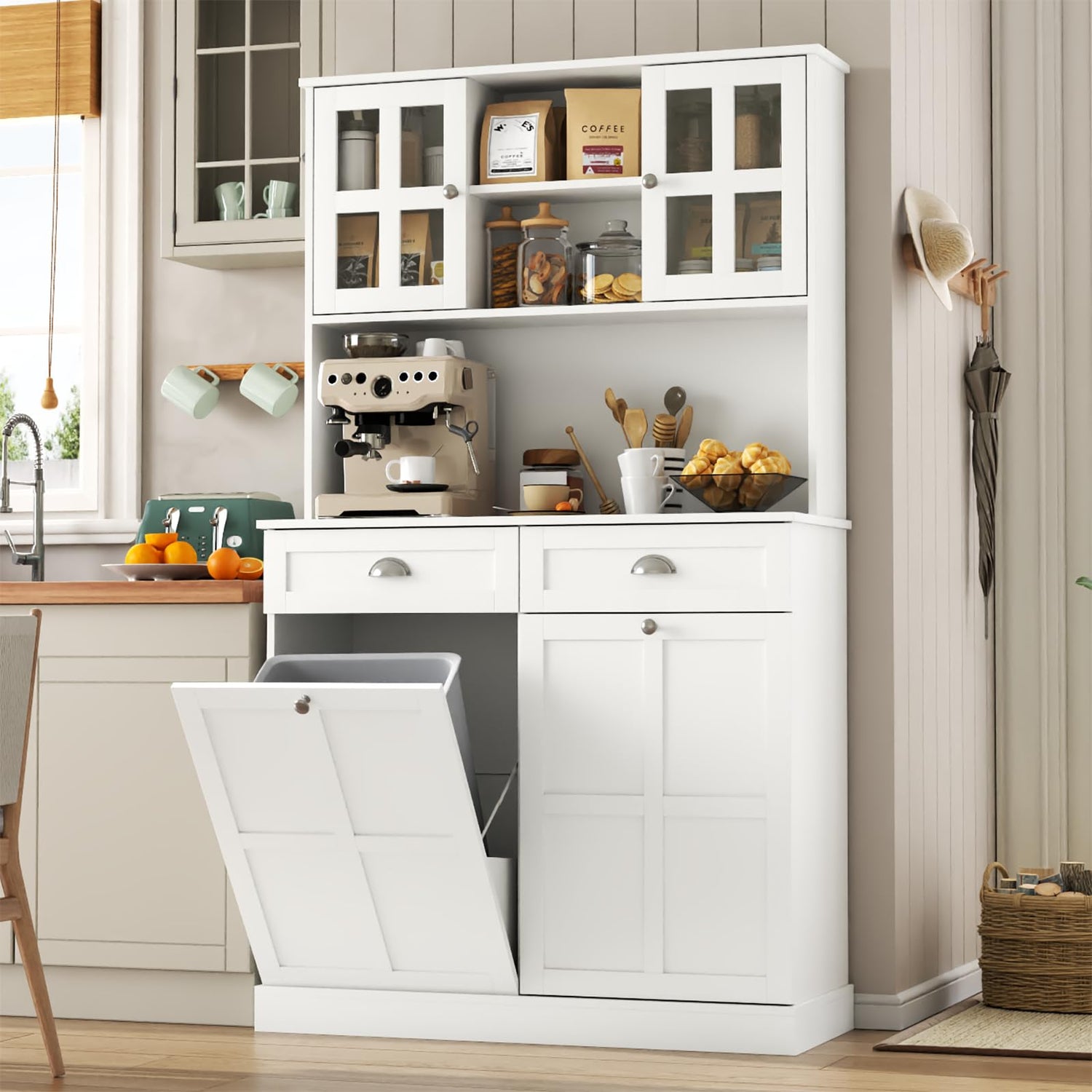 Double Tilt Out Trash Can Cabinet, 68" Tall Kitchen Pantry Storage Cabinet with 2 Drawers & Hutch & Microwave Coffee Stand, Freestanding 20 Gallon Trash Recycling Cabinet, Hidden Garbage Can Cabinet