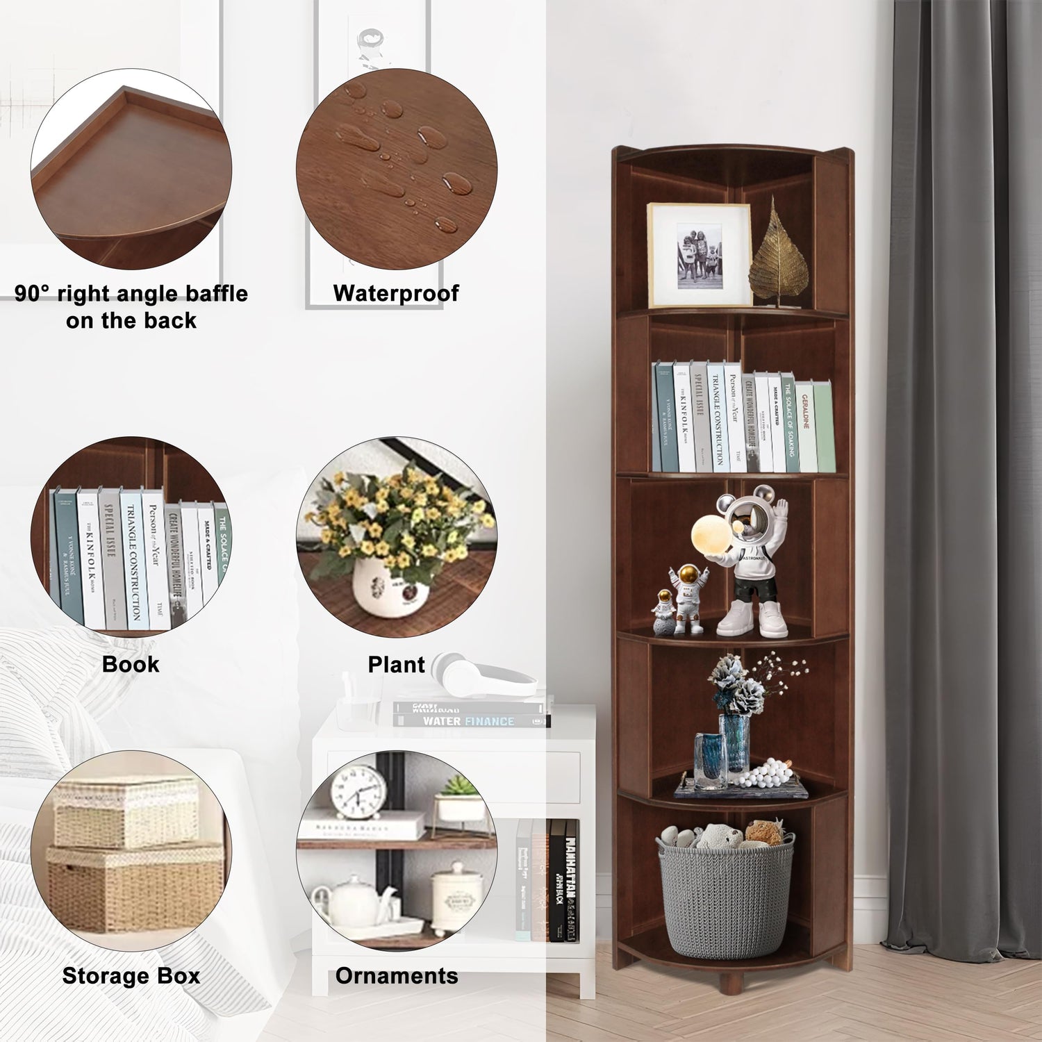 DOUSY-5 Tier Bamboo Corner Shelf, Mid Century Modern Corner Bookshelf, 69" Tall Stylish Bookcase Display Rack Plant Stand for Living Room, Bedroom, Home Office, Kitchen, Walnut