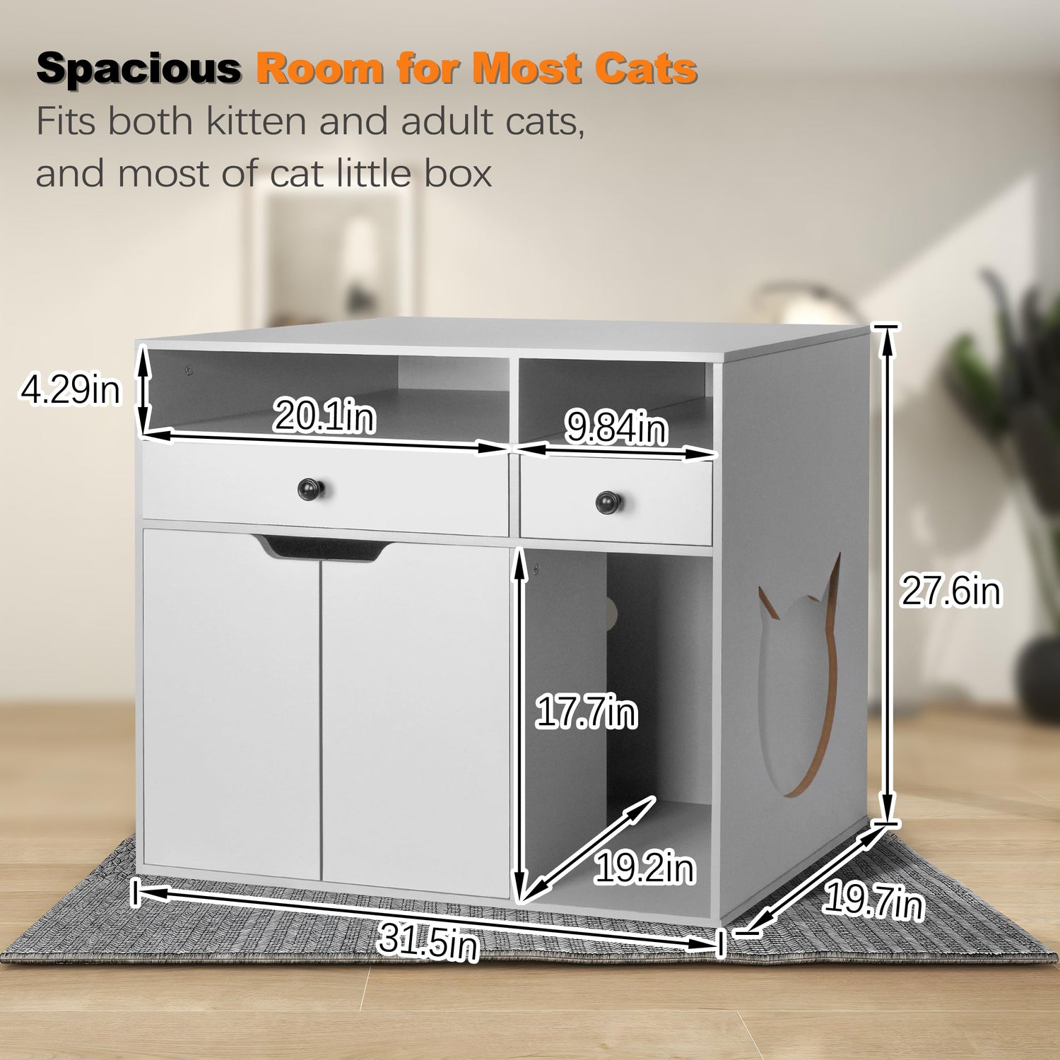 - 😻【Fits Most Litter Boxes】This cat litter box enclosure furniture is designed to fit most standard litter boxes. With double cabinet doors for easy scooping and cleaning, giving the once-messy litter box area a makeover. Overall dimensions: 31.5"L x 19.7"W x 27.6"H. Litter box enclosure size: 20"L x 19"W x 17.7"H.