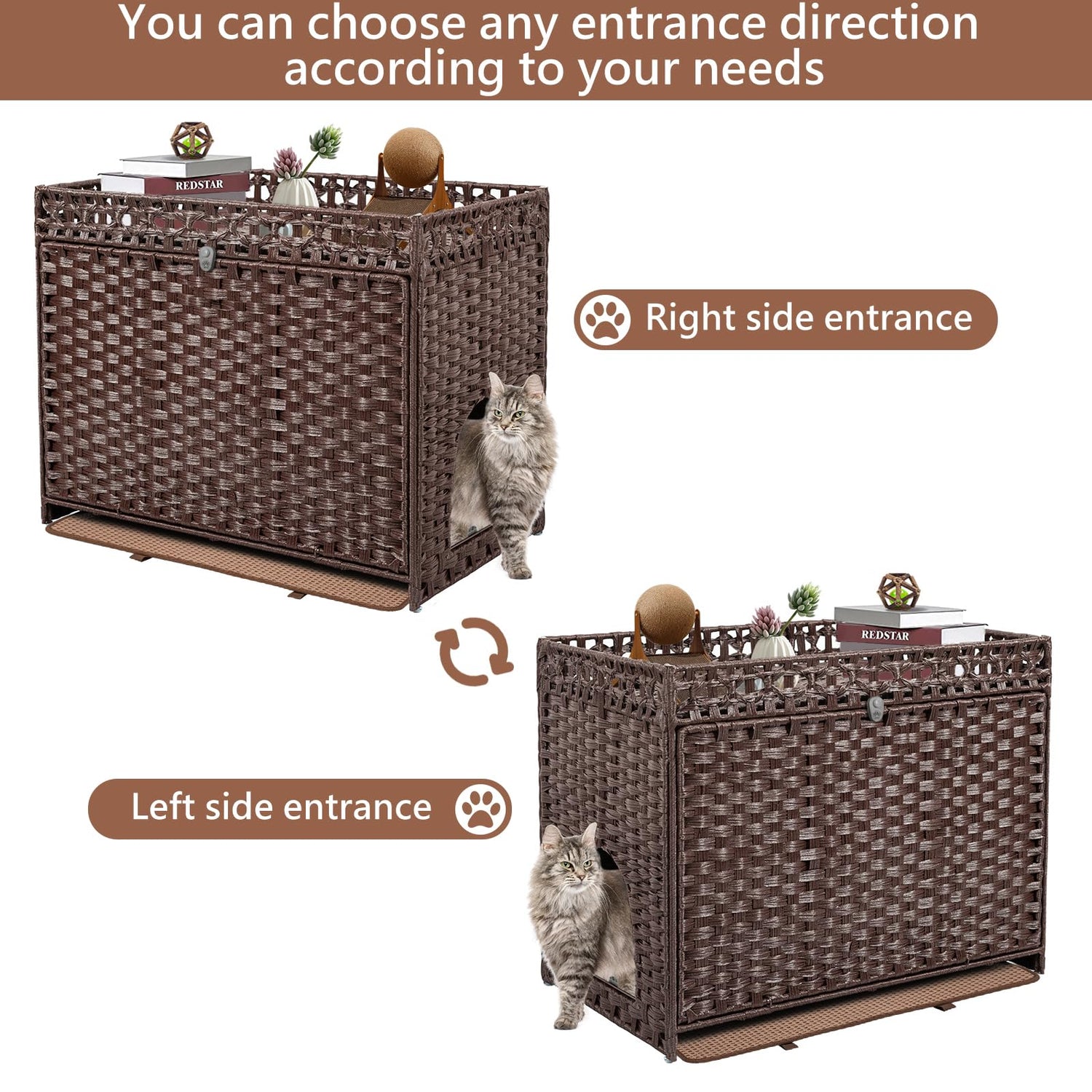 - Easy to Clean: Cleaning the cat litter box enclosure furniture is hassle-free. It features 1 convenient side door and 2 removable bottom mats that prevent cat litter splashing and keep litter off the floor, saving you time and effort. Meanwhile, the large rattan cat enclosure box, helping to contain the smell, also incorporates proper ventilation, keeping your home fresh and odor-free