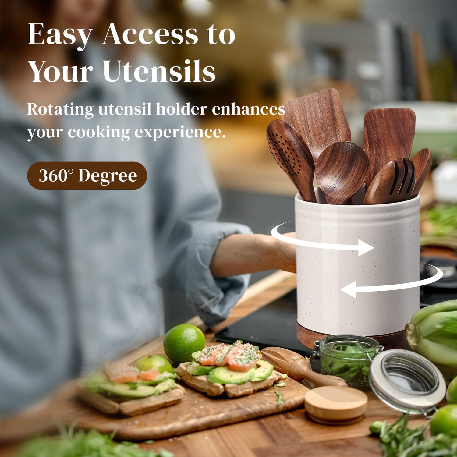 - 360° Rotating Convenience: Simplify your cooking routine with our rotating utensil holder! No more fumbling for tools—this kitchen utensil holder features a smooth, silent spin for a noise-free experience. Designed like a lazy susan, the spinning utensil holder allows you to easily grab the right spatula or tool with just a quick turn. Keep your kitchen organized and make cooking more efficient with this practical cooking utensil holder.