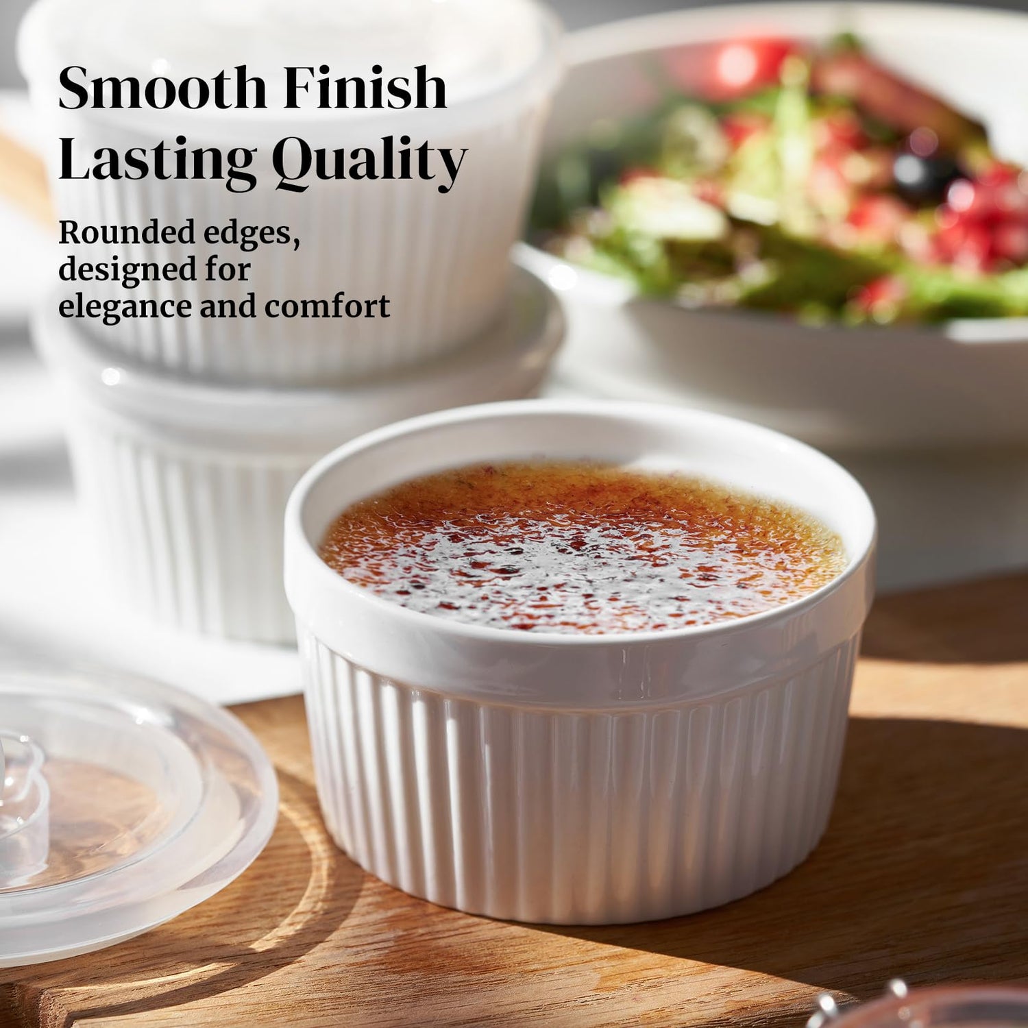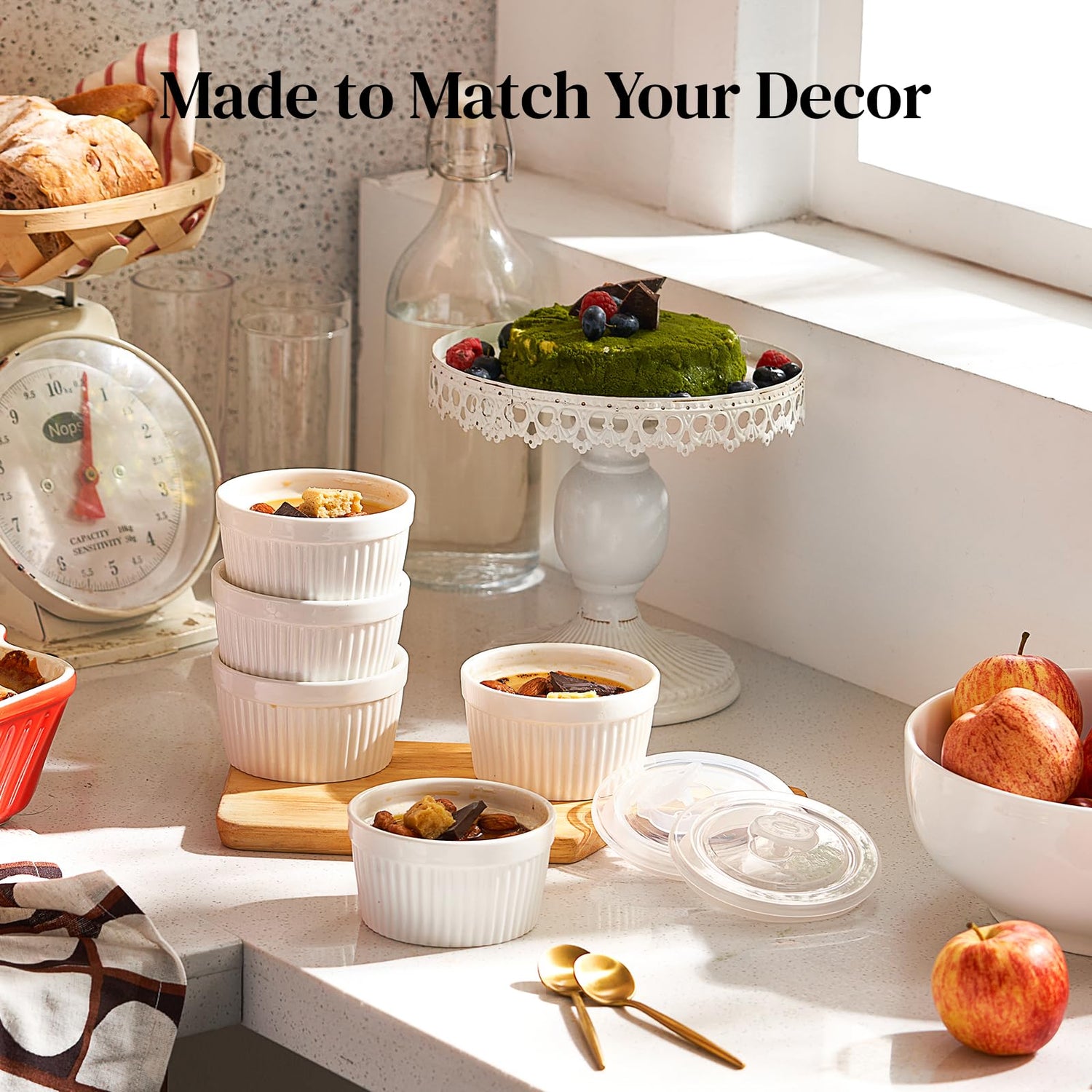 DOWAN Ramekins 8 oz Oven Safe with Lids, Creme Brulee Ramekins Bowls, Porcelain Ramiken Souffle Dishes, Custard Cups for Baking, Small Bowls for Pudding Dip Sauces Charcuterie Dessert, White, Set of 6