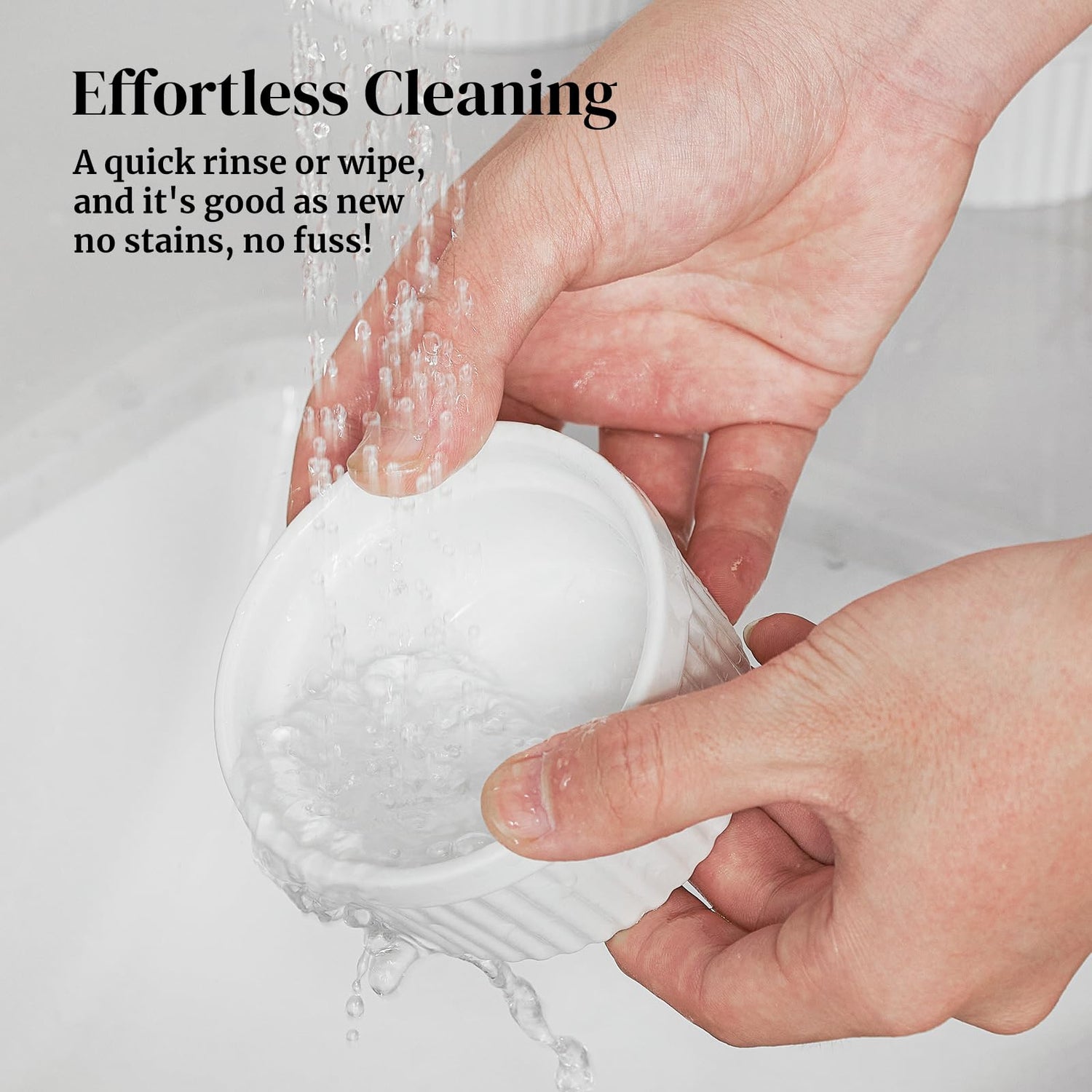 - Ideal Size for Everyday Meals: These ramekins are the perfect size for individual servings, measuring 4 x 3.3 x 2.2 inches with an 8 oz capacity. They are ideal for a variety of dishes, including crème brûlée, soufflés, dips, and other small baked treats. Crafted from durable ceramic, these oven-safe ramekins offer excellent heat retention for even baking. Whether you're using them in the microwave, air fryer, or oven, these ramekins for baking are designed for convenience