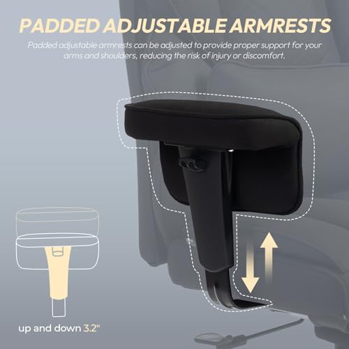 - Flexible Adjustability: This executive chair offers a reclining range from 90° to 135°, accommodating various activities whether you’re working or relaxing. Additionally, the adjustable padded armrests can be set to your preferred height, ensuring personalized comfort and support