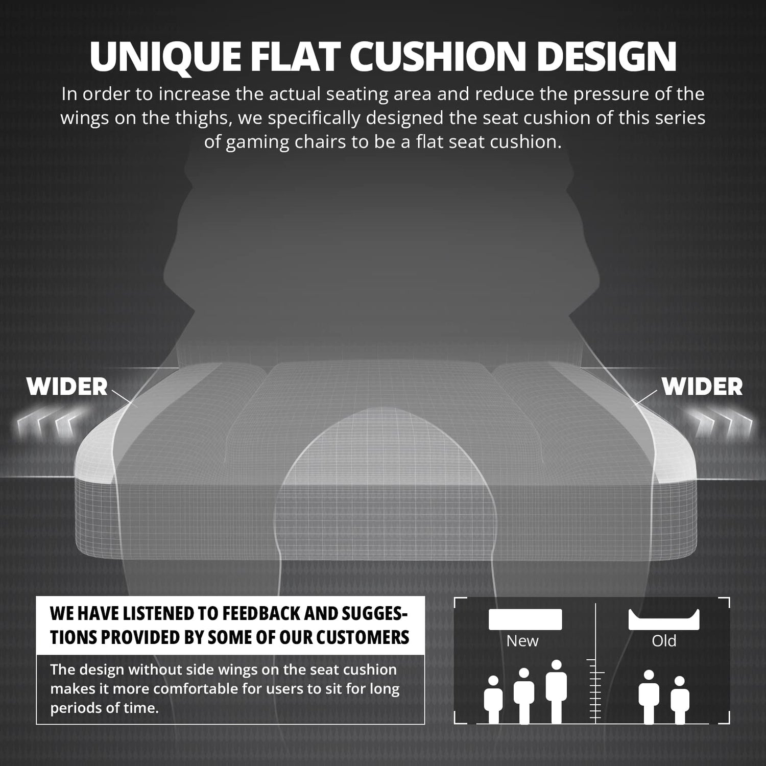 - 【AIMING FOR A LARGER SEATING AREA】Our flat seat cushion design offers a more spacious seating area, with at least 10cm of extra width compared to typical gaming chair cushions. Removing the side wings also reduces pressure on the legs, allowing for a more relaxed and comfortable sitting experience.