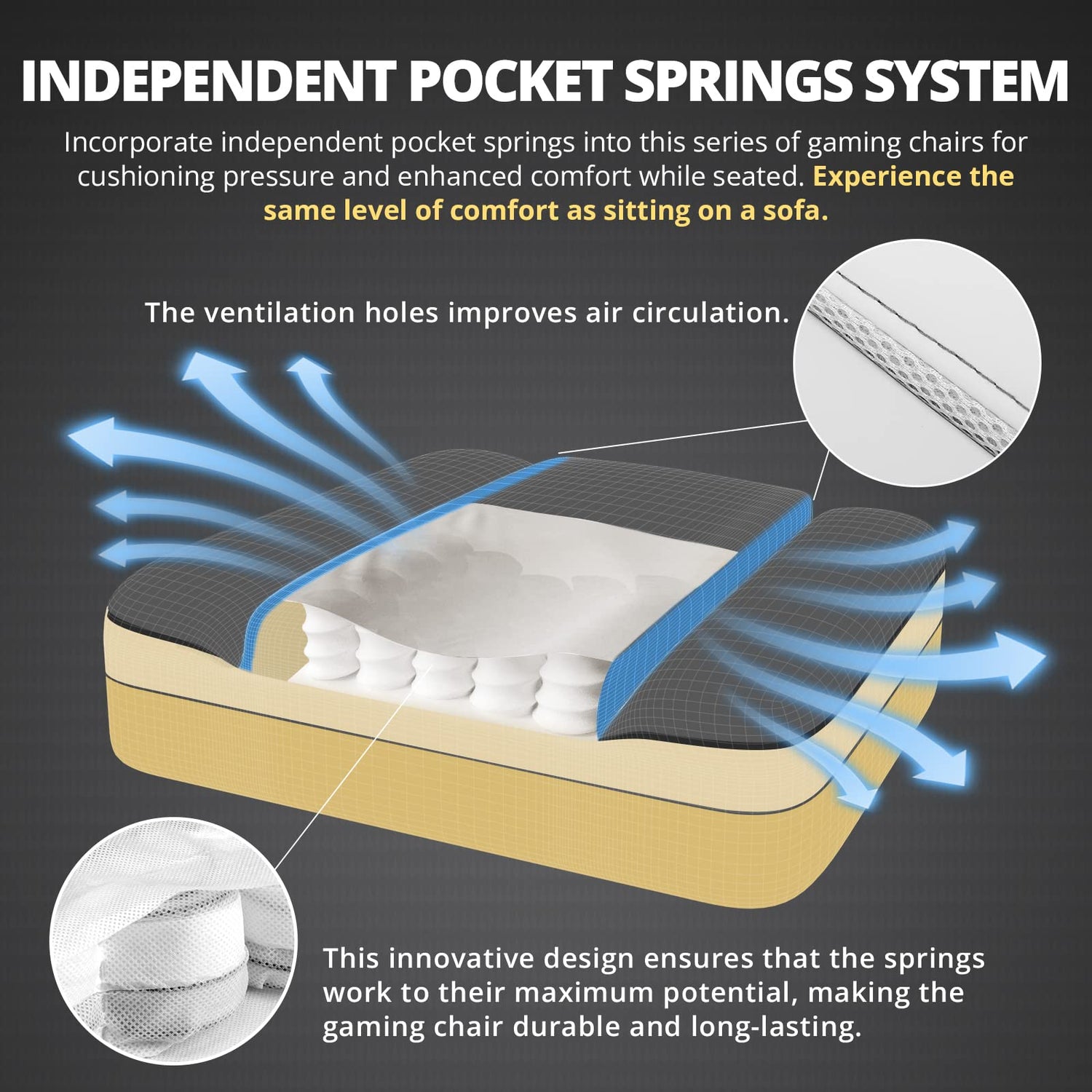- 【ORIGINAL POCKETED SPRINGS CUSHION】We have incorporated independently pocketed springs commonly found in mattresses into our gaming chair. These springs distribute body weight evenly and provide the appropriate level of support, effectively relieving pressure on the lower back. Additionally, the design features air holes which increase the load capacity of the spring system while also minimizing noise.