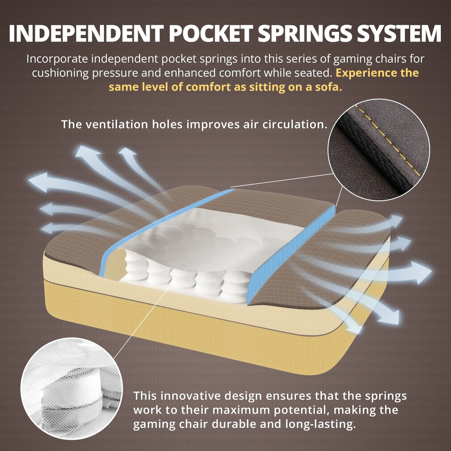 - 【ORIGINAL POCKETED SPRINGS CUSHION】We have incorporated independently pocketed springs commonly found in mattresses into our gaming chair. These springs distribute body weight evenly and provide the appropriate level of support, effectively relieving pressure on the lower back. Additionally, the design features air holes which increase the load capacity of the spring system while also minimizing noise.