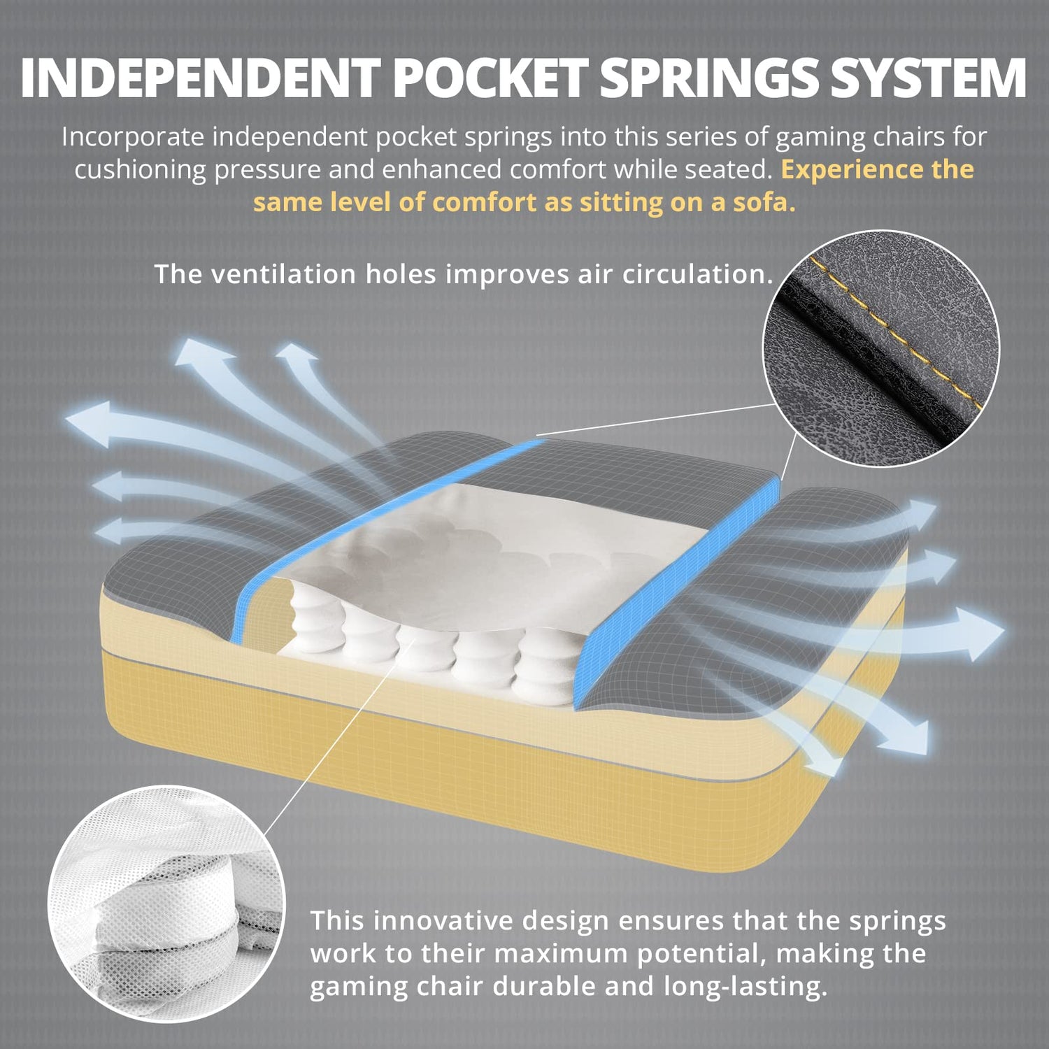 - 【ORIGINAL POCKETED SPRINGS CUSHION】We have incorporated independently pocketed springs commonly found in mattresses into our gaming chair. These springs distribute body weight evenly and provide the appropriate level of support, effectively relieving pressure on the lower back. Additionally, the design features air holes which increase the load capacity of the spring system while also minimizing noise.