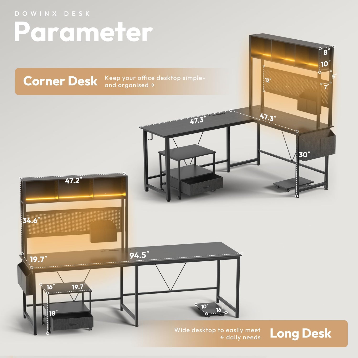- Create the Ideal Workspace: The L-shaped desk comes with top hutch, pegboard wiht 5 hooks, removable file cabinet, headphone hook, 2 storage bags, power outlets, LED lights, CPU holder, cable management holes, and an extra-long desk that can accommodate up to 3 monitors. Support your ideal office space or gaming space.