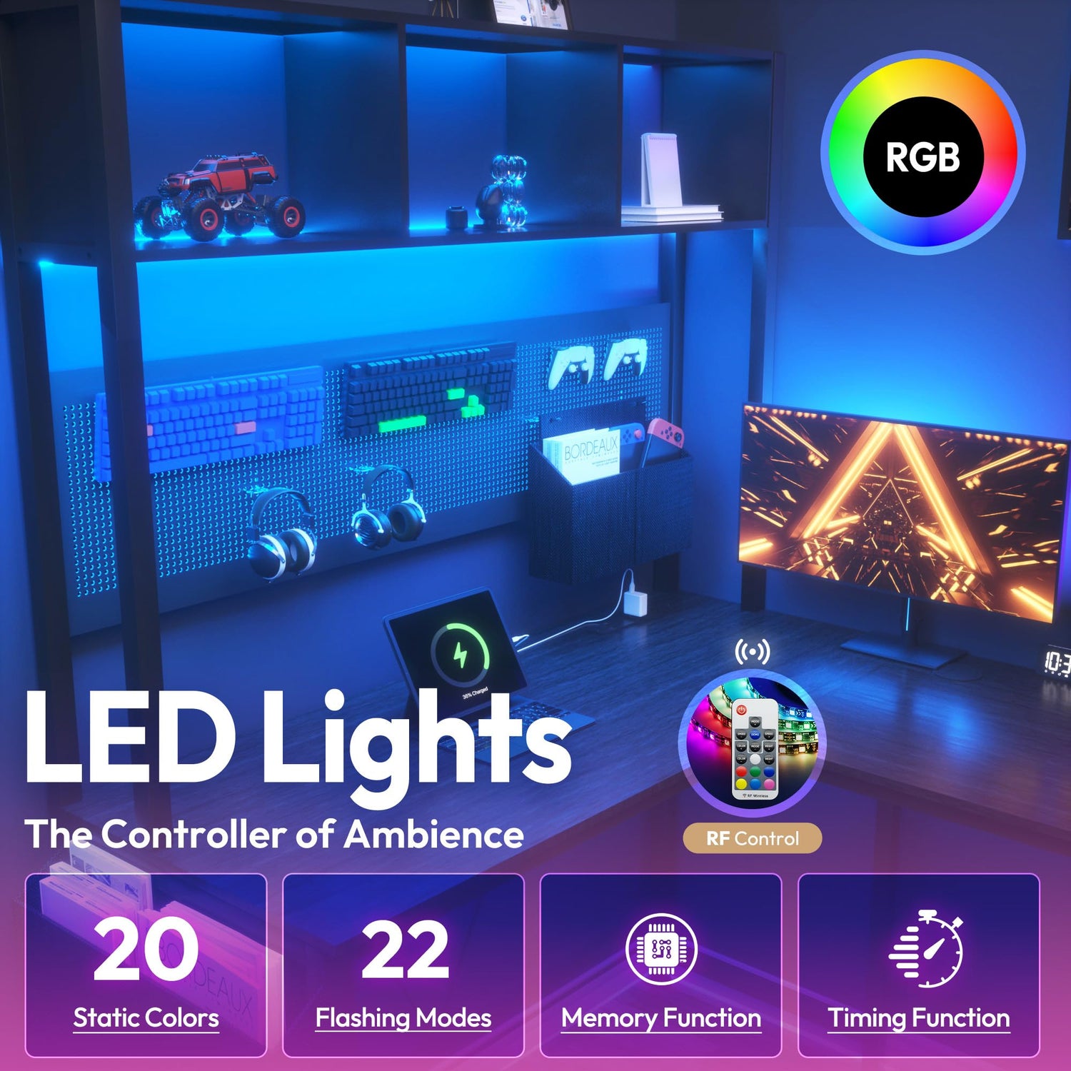 - Cool Smart LED Lights: The gaming desk is equipped with RGB LED lights that can be remotely controlled via remote with over 20 statics colors, 22 flashing modes and demo mode, and The brightness of the light can be adjusted; The lights feature a memory function that keeps them on the last mode when turned on