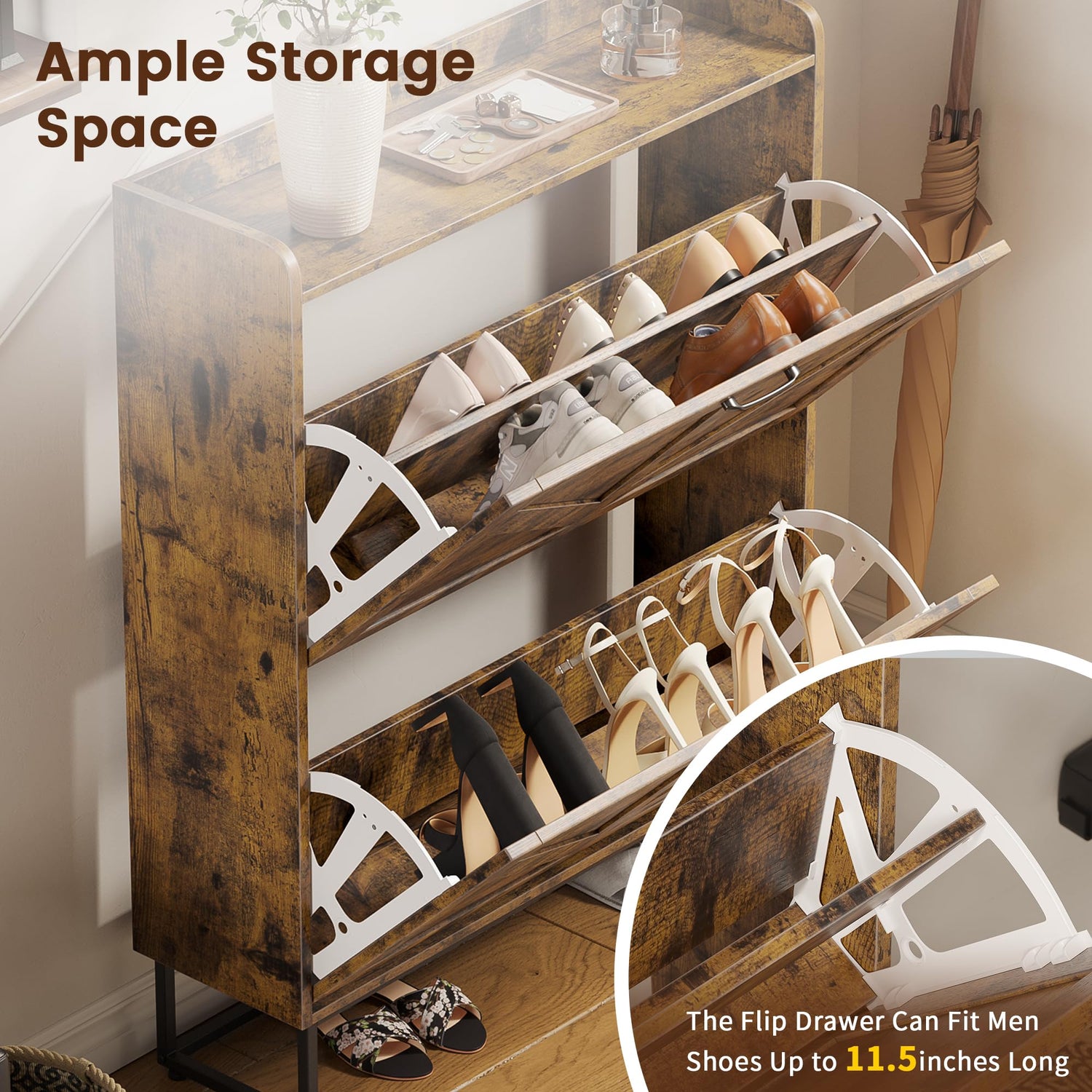 Dowinx Shoe Cabinet Storage with 2 Flip Drawers, Freestanding Shoe Organier Cabinet with Metal Legs, Farmhouse Narrow Shoe Stroage Cabinet Hidden for Entryway Hallway, Rustic Brown