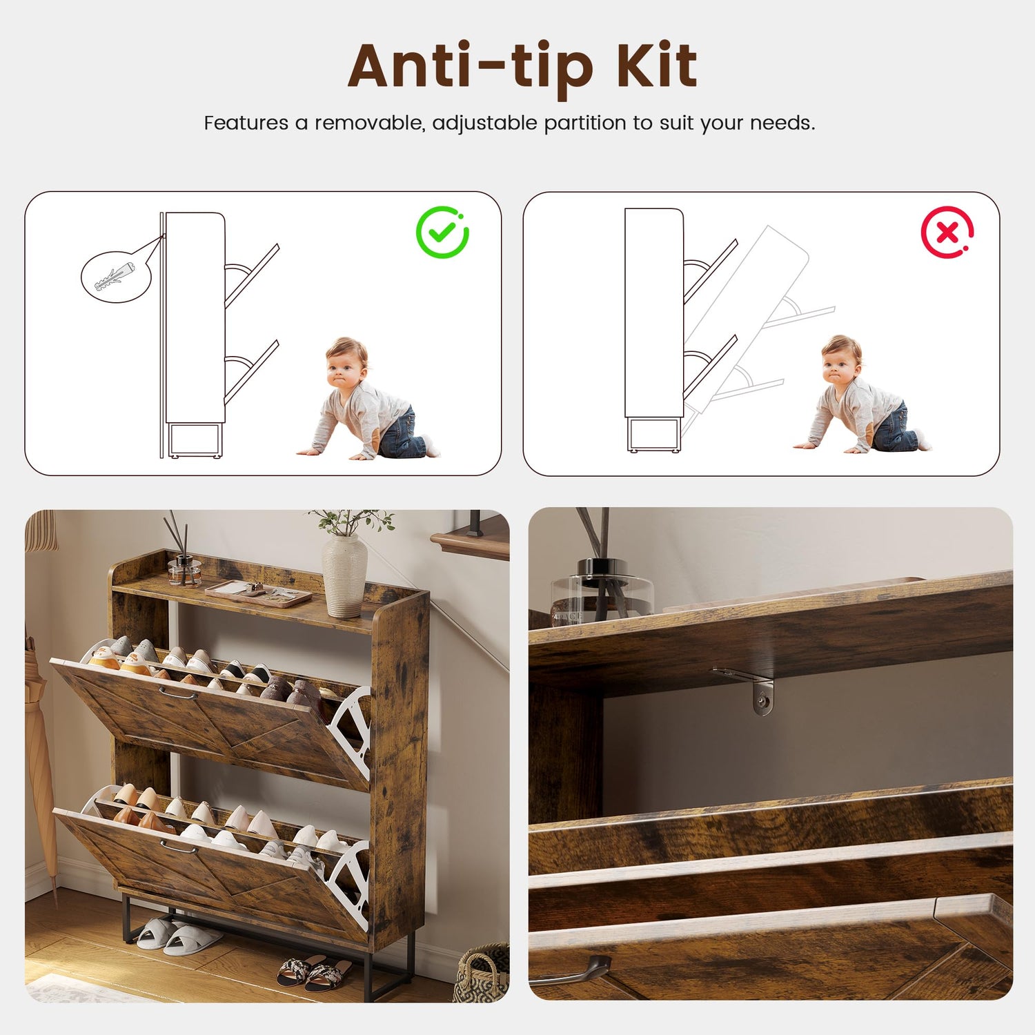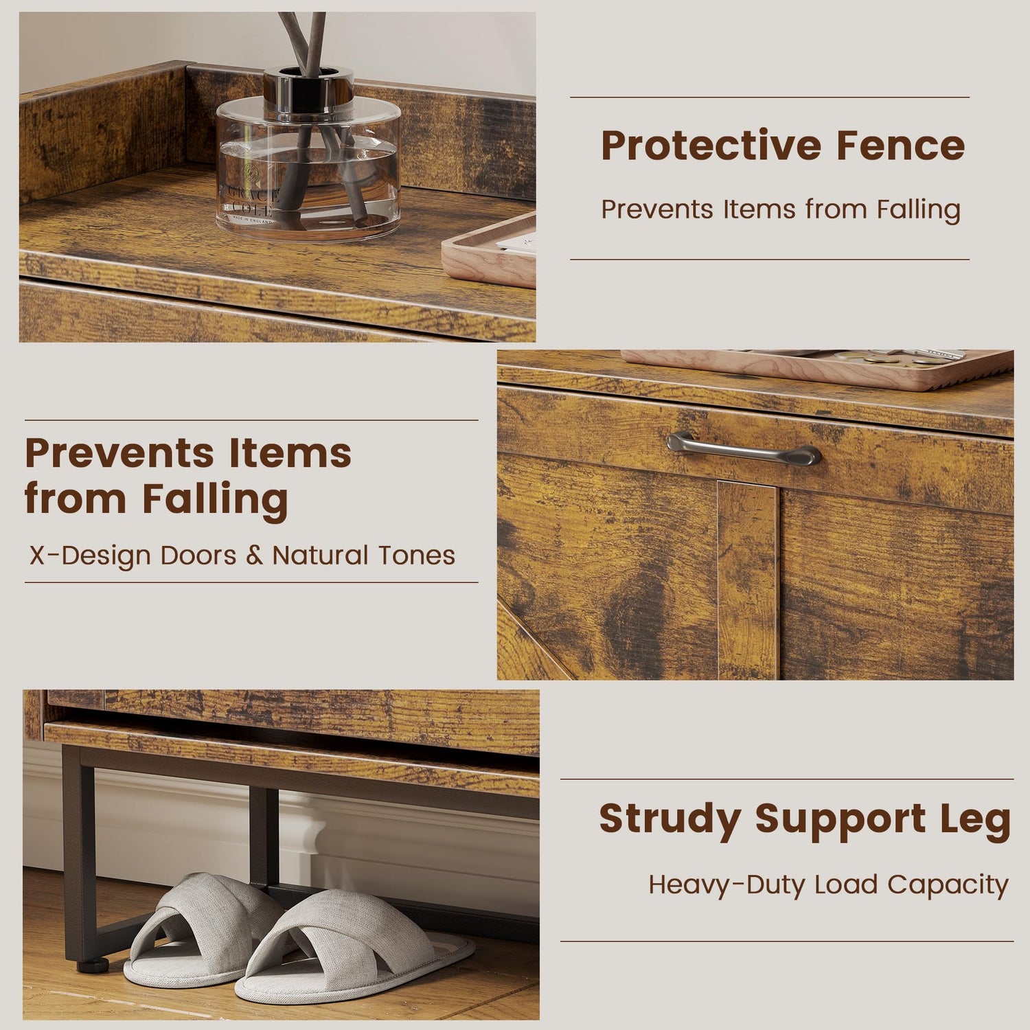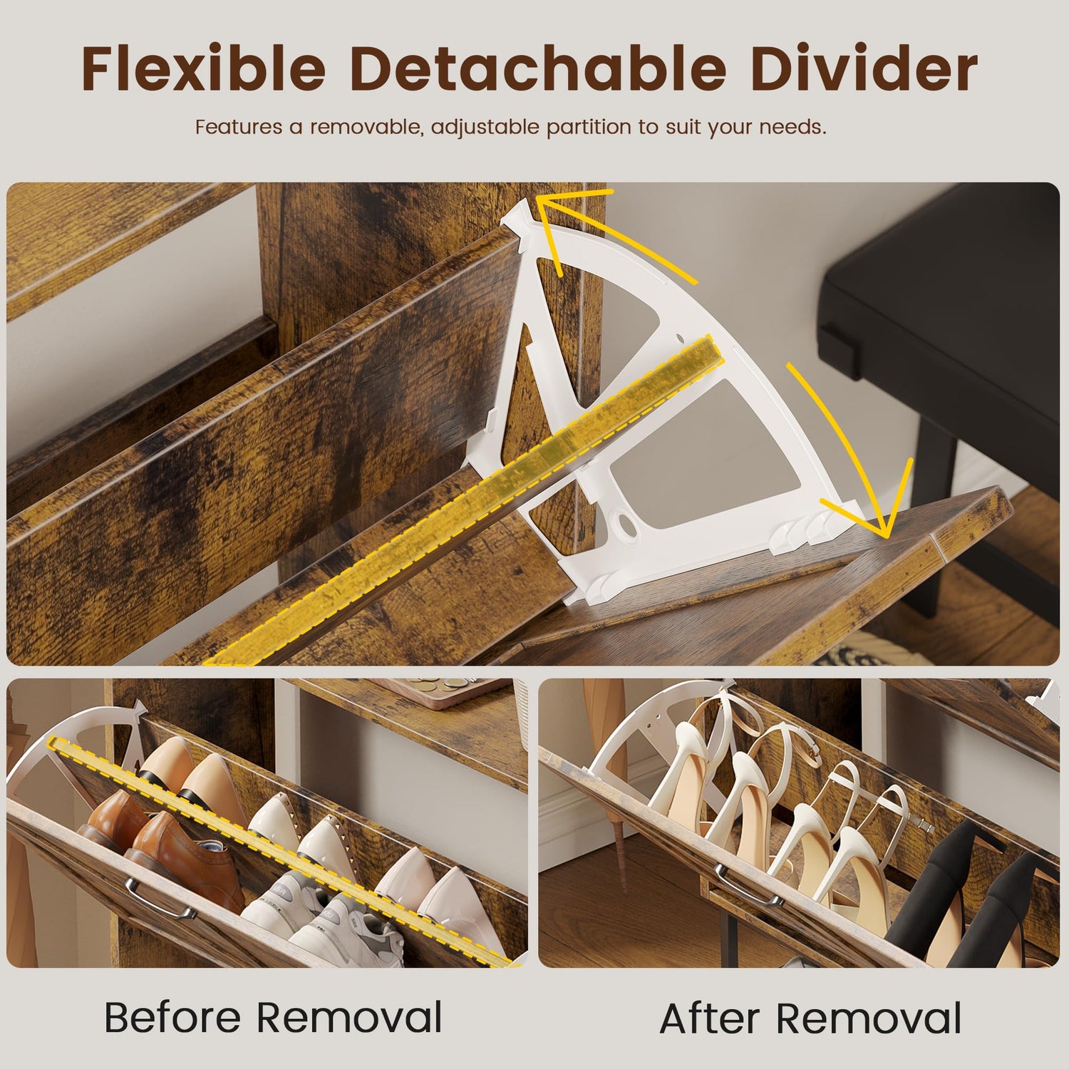 - Hidden Shoe Storage with Flip Drawers: This farmhouse shoe storage cabinet features 2 front-facing flip drawers with double-layer compartments, offering hidden shoe storage that keeps footwear dust-free and pet-safe. Each drawer includes adjustable dividers to fit flats, boots, or heels of various heights—perfect for personalized organization.