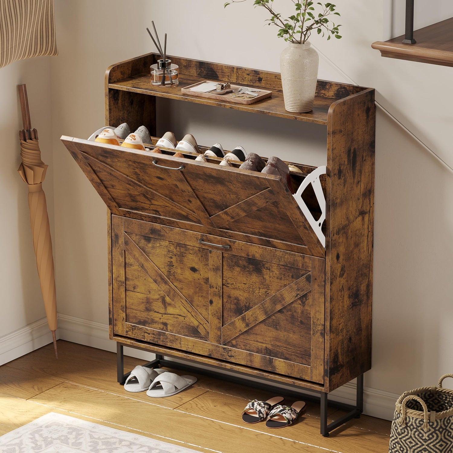- Farmhouse Meets Modern Functionality: Finished in warm brown with clean lines, this shoe cabinet for entryway adds a farmhouse yet refined look to any space. Whether placed in your foyer, hallway, or mudroom, this shoe cabinet blends seamlessly into a variety of home décor styles while delivering dependable storage.