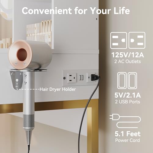 - Upgraded Vanity with Power Outlet & Hairdryer Holder: Equipped with 2 outlets and 2 USB ports, this elegant white vanity powers your hair dryer, curling iron, and devices simultaneously. The side hairdryer holder provides a convenient place for your hairdryer.