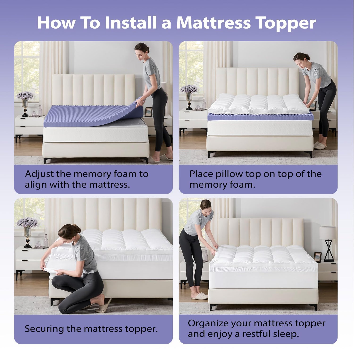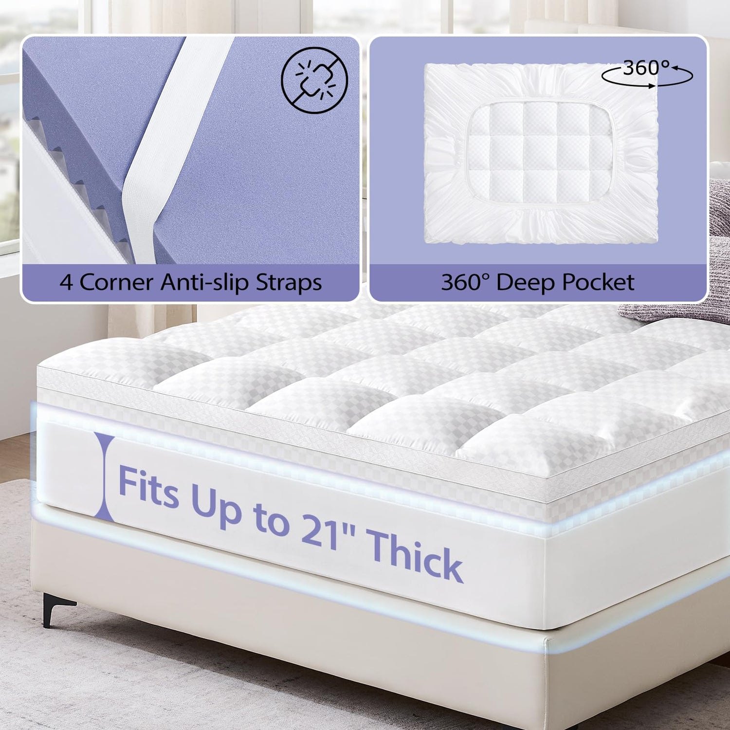 - IDEAL FOR ANY BEDROOM: No more waking up to a shifted mattress topper! The anti-slip straps securely anchor the pillow top mattress topper to your mattress, while the deep-pocket design stretches up to 21 inches, fitting most mattresses with ease. The four corner anti-slip straps ensures a snug fit, so your egg crate mattress topper stays in place night after night