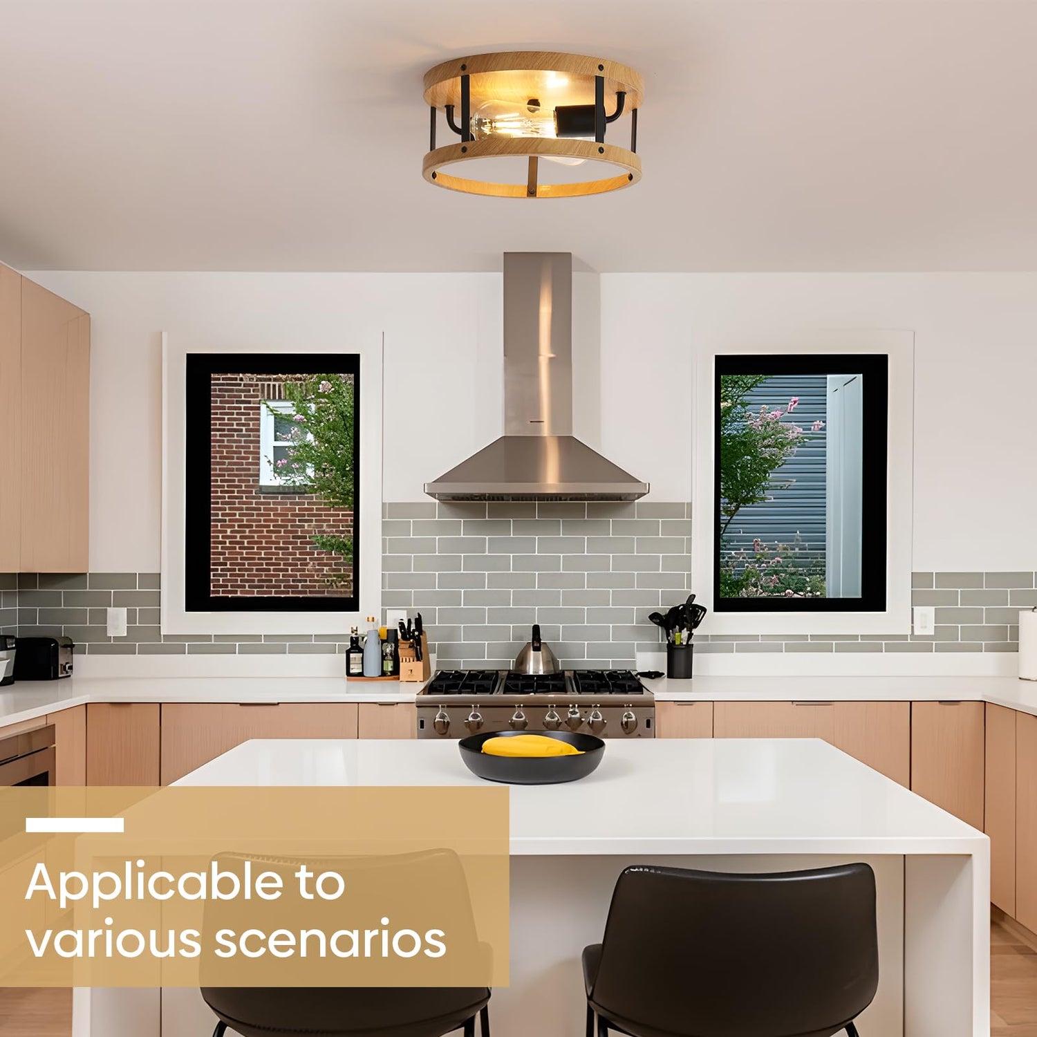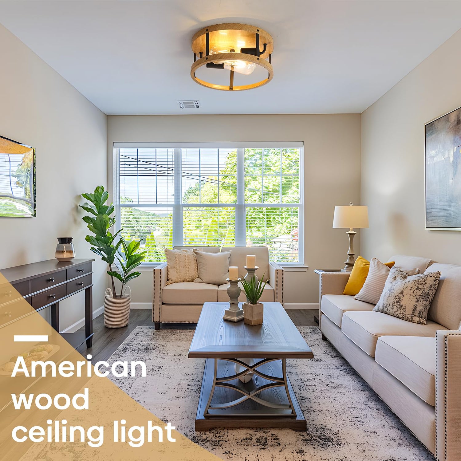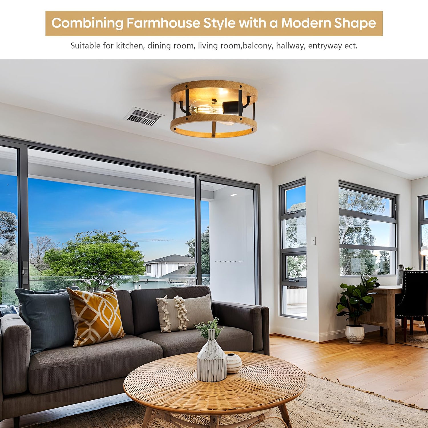 - WOOD FINISH CELING LIGHTS: This semi flush mount ceiling light retains the classic but also innovates on the basis of the classic, with smooth lines, a clean line geometric shade with wood finish. Farmhouse style for indoor decoration