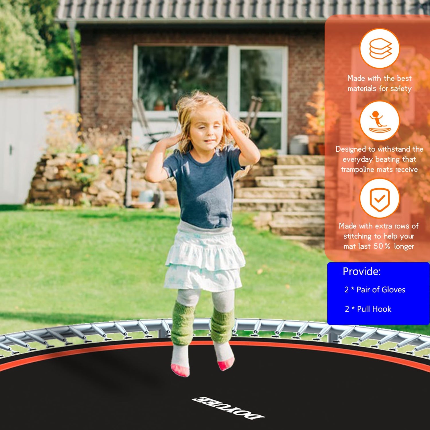 - Packing List:1*Trampoline Mat,2*Pull hook,2 Pairs of gloves. Provide 2 hooks and 2 pairs of gloves, which are convenient for two people to install together and improve efficiency.