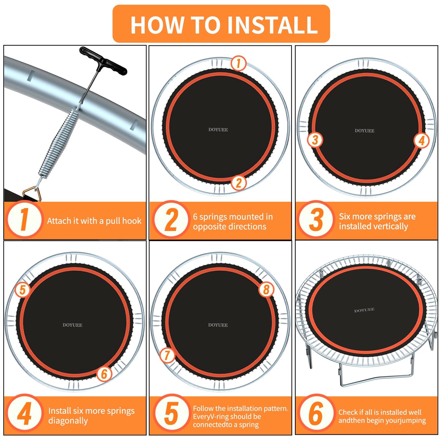 • Packing List:1*Trampoline Mat,2*Pull hook,2 Pairs of gloves. Provide 2 hooks and 2 pairs of gloves, which are convenient for two people to install together and improve efficiency.