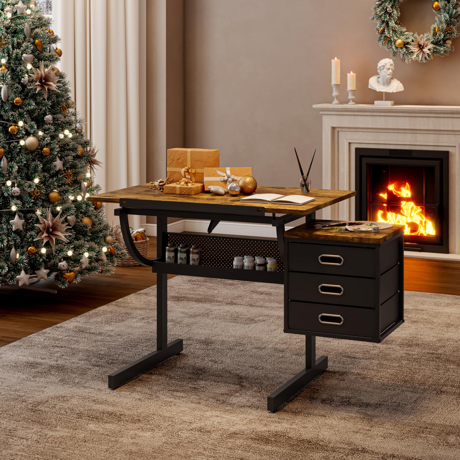 Drafting Table with Storage for Adults/Artists, Drawing Art Desk with 3 Drawers and Stool,Tabletop Adjustable Art Table Workstation for Studio Home Office School,Black