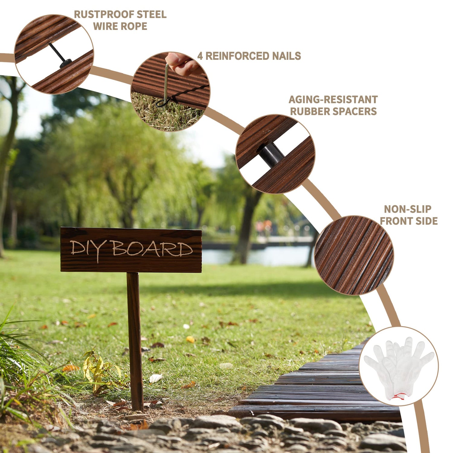 - 【REINFORCED CONNECTION】: Each wood piece of this wooden walkway is connected with rustproof steel wire ropes that make sure each piece is firmly connected. In addition, the rubber spacers are more aging-resistant than other PVR and nylon spacers and endow better protection to the wood surface. So this wooden garden pathway can bear greater weight and and suitable for longer term use.