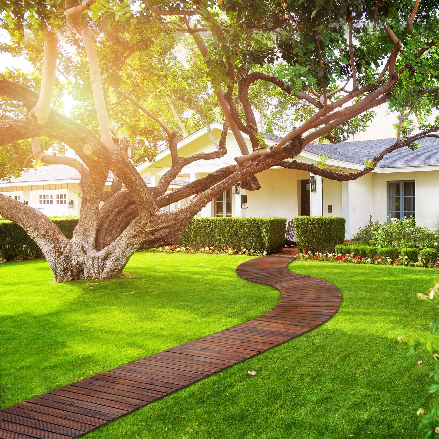 - 【HIGH-QUALITY CEDARWOOD】 The natural and durable wooden walkway is made of pressure-treated cedarwood, which has greater bearing capacity and can better prevent rot, cracking, UV resistance, fading and weather resistance. In addition to resisting extreme sunny days, it also can resist wet weather.