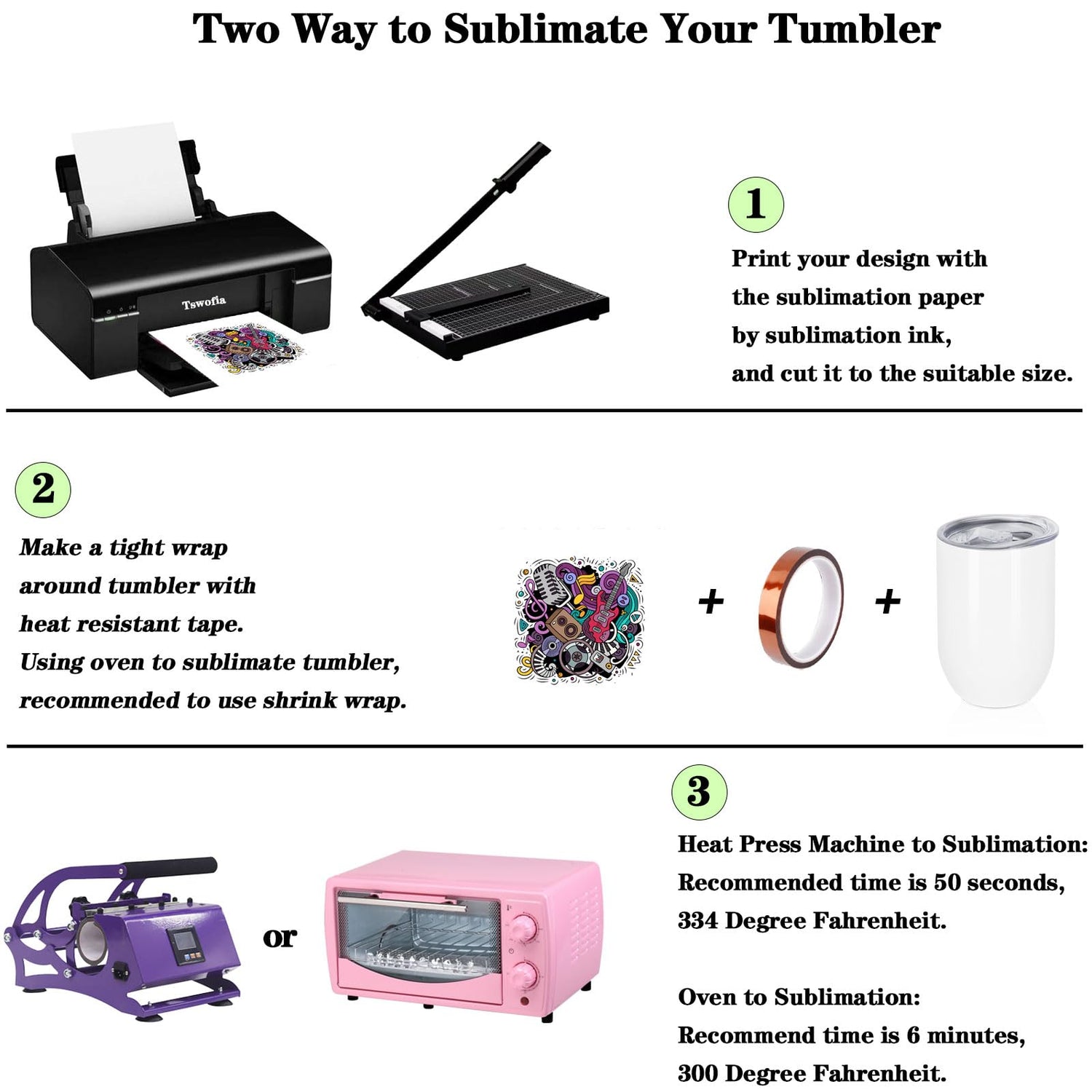 - TWO WAYS TO SUBLIMATE: If you choose heat press machine to sublimate your tumblers, set temperature to 330 degrees Fahrenheit for 50 seconds and rotate to the other side for 50 seconds. If you use oven, set temperature to 300 degrees Fahrenheit for 5-6 minutes.