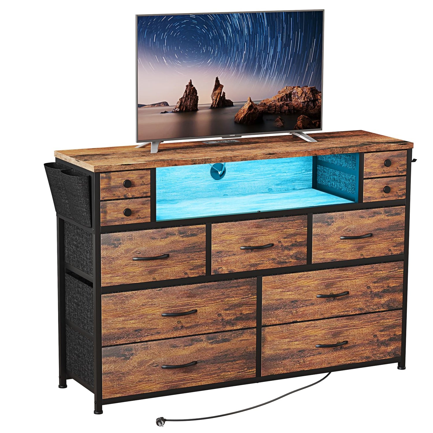 DRAWERHOM Dresser TV Stand with Power Outlets and LED Lights for 55'' TV, 11 Drawers Dresser with Side Pocket, Fabric Chest of Drawers with PU Finish, Sturdy Frame & Wood Top (Rustic Brown)