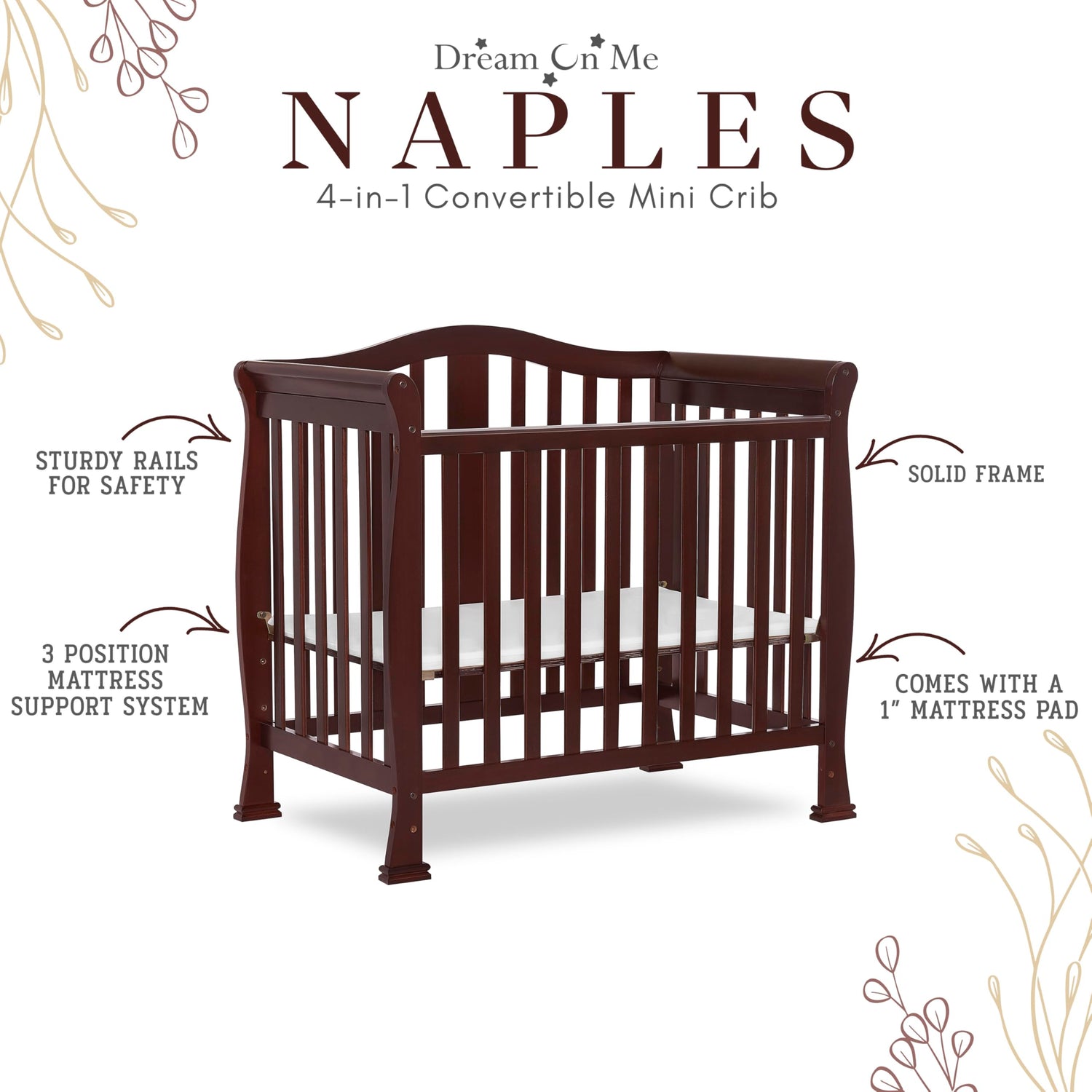 - MANY BENEFITS: The crib has a 3-position adjustable mattress height setting & Comes with a 1" OEM Mattress pad. For additional aftermarket mattress purchase, we recommend any Dream On Me, non-toxic, Greenguard certified mini crib mattress.