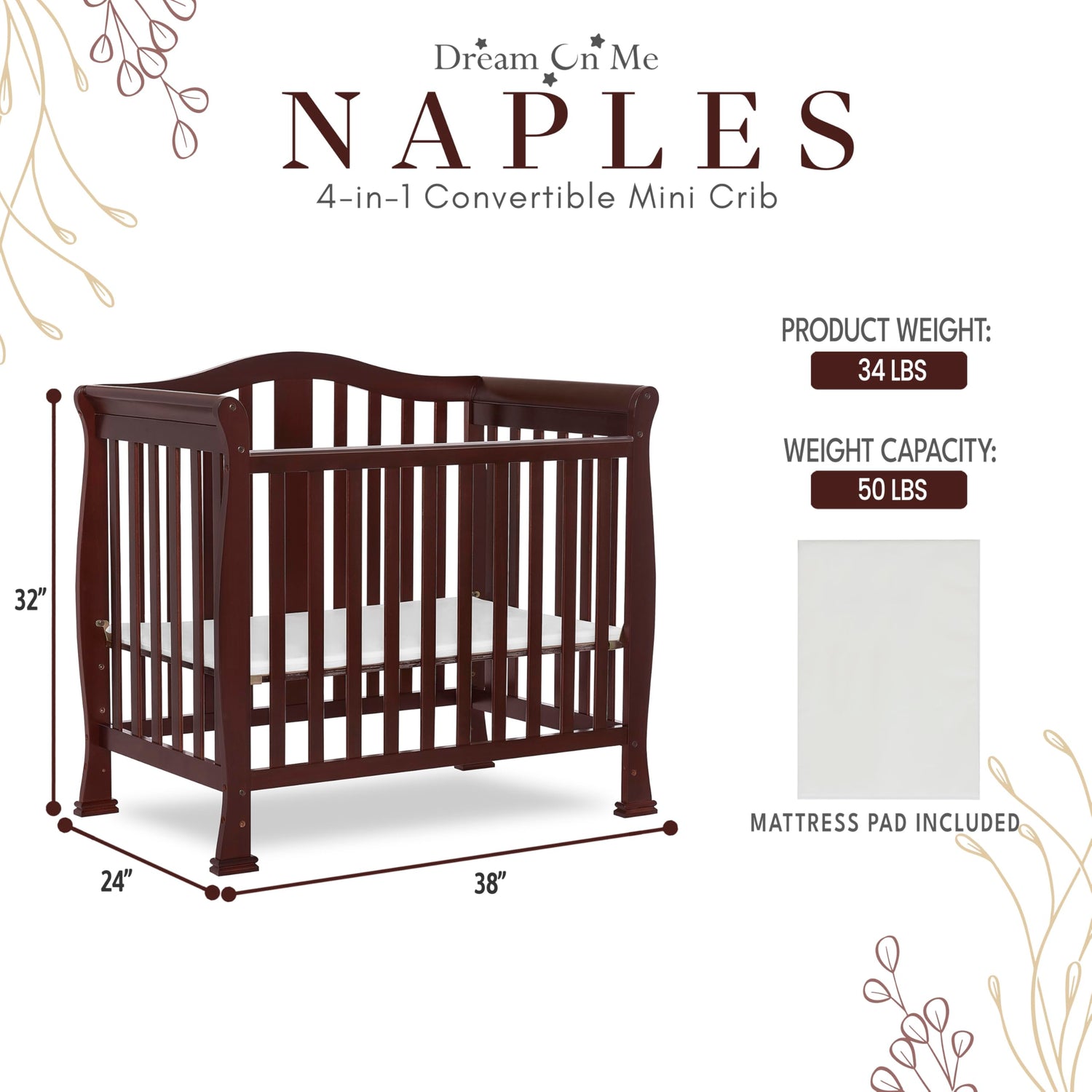 Details: What makes the Addison 4-in-1 Mini Convertible Crib a stylish and convenient nursery solution? Use it as a mini crib, mini daybed and twin-size bed (bed rails sold separately) to keep pace with your child! Comfortable yet compact, it’s ideal to free up nursery space or to use in grandma’s home. Built of New Zealand pinewood, its minimalist design features gentle, smooth arches & sturdy spade feet making it a beautiful piece of furniture. The contemporary styling allows it to blend easily into any nursery decor.The crib has a 3-position adjustable mattress height setting to accommodate your growing child & comes with the regulatory 1” mattress pad. Choose a Dream On Me non-toxic, Greenguard Gold certified portable crib mattress for a perfect fit. The Addison is available in beautiful non-toxic baby-safe finishes which can match perfectly with whatever nursery theme that you choose. All Dream On Me cribs meet/exceed applicable JPMA, ASTM & CPSC standards. Product dimensions are 38L x 24W x 32H inches and the maximum weight limit is 50 lbs. All tools/assembly instructions included.
