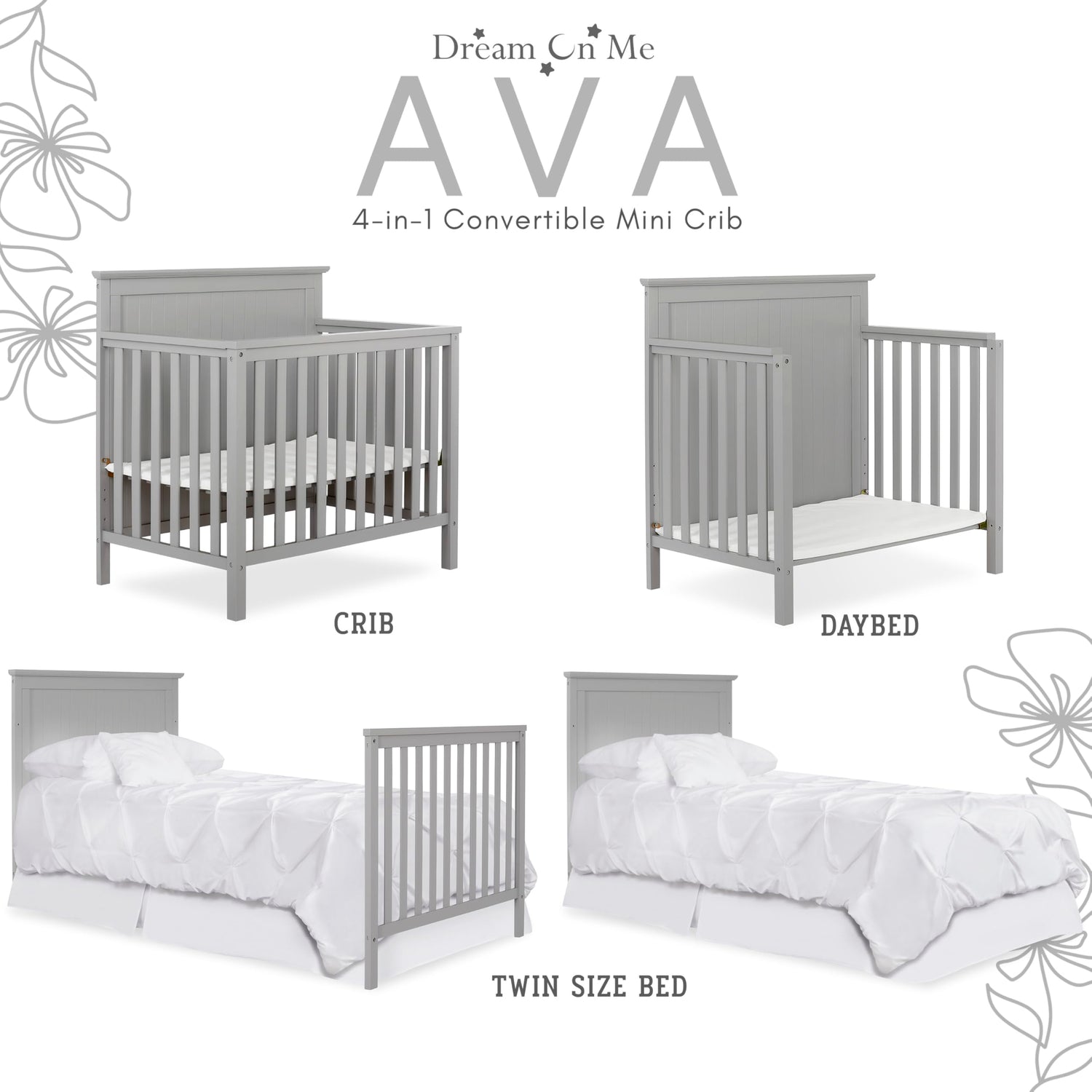 • CONVERTIBILITY OPTIONS: The Ava 4-in-1 Convertible Mini Crib grows with your child. Starting as a mini crib, you can convert it into a mini daybed and twin-size bed (bed rails sold separately) Built of solid pinewood, it makes for a durable investment